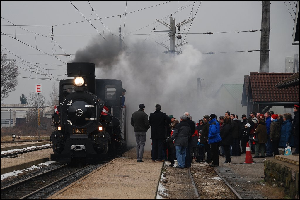 Weihnachtszug ins Dirndltal 2010 - überraschenderweise wurde der Zug bereits ab St.Pölten mit der Dampflok Mh.6 bespannt. Hier bei der Einfahrt Ober Grafendorf, wo schon viele auf den Zug warten. (24.12.2010) Tobias Moser