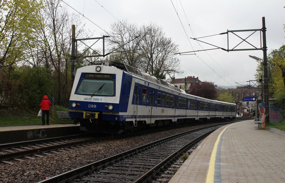 Nach dem kurzen Aufenthalt am regnerischen 19.4.2022 hat der 4020 305 als S80 25040 die Haltestelle Wien Speising verlassen und befindet sich bereits im Bahnhof Wien Maxing auf seinem Weg nach Wien Aspern Nord. Max Kiegerl