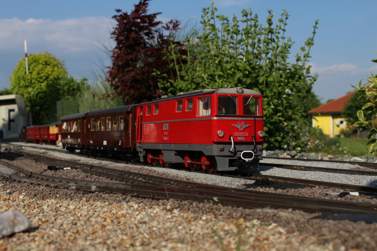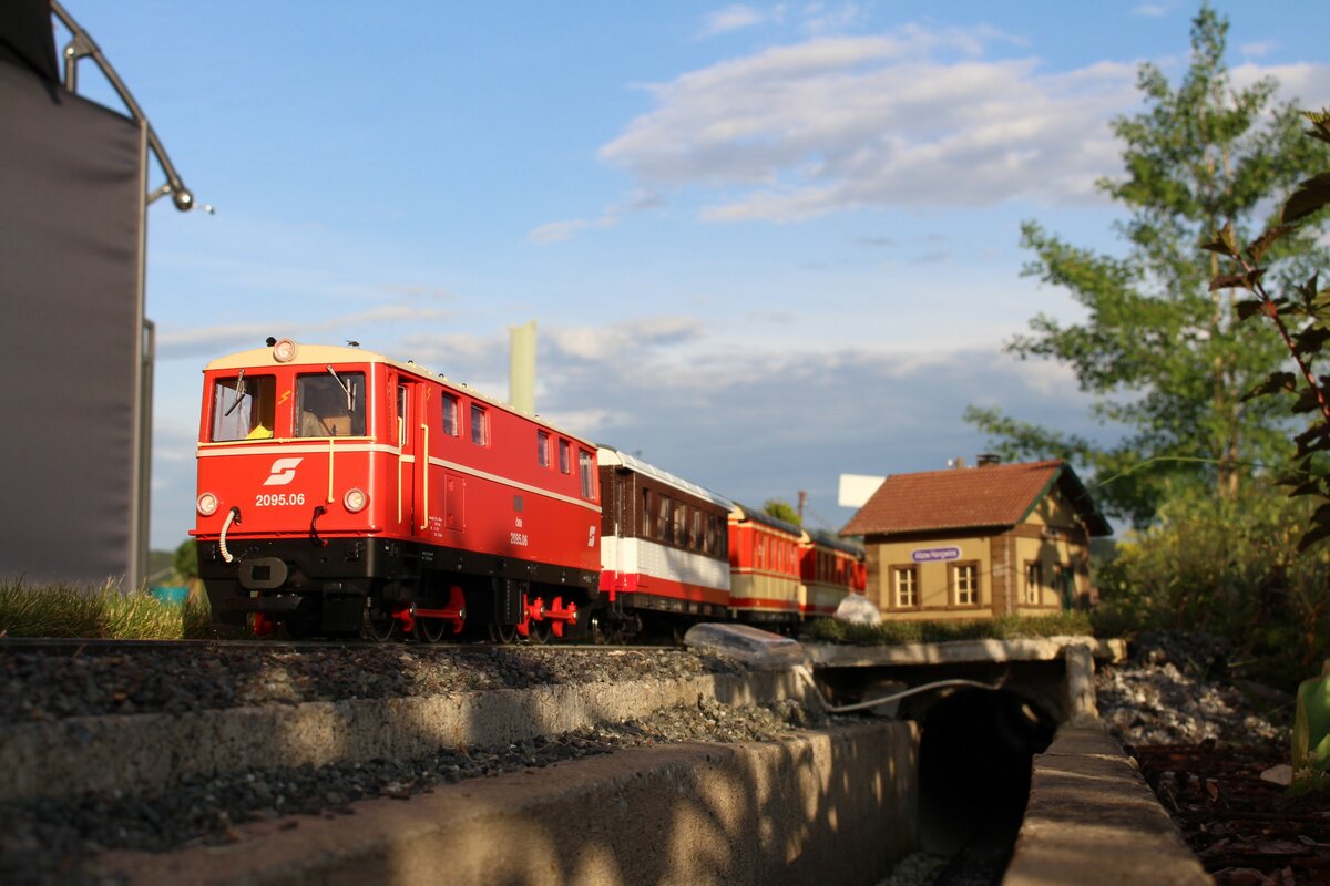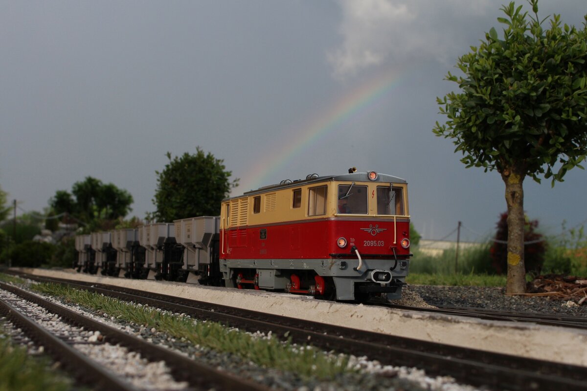 Im letzten Abendlicht eines schwülen Maitages 2001 fährt die 2095.06 mit ihrem Regionalzug bei der Abzweigstelle Hangwies ihrem Ziel Brunn am Berg entgegen und den aufziehenden Gewitter davon.
