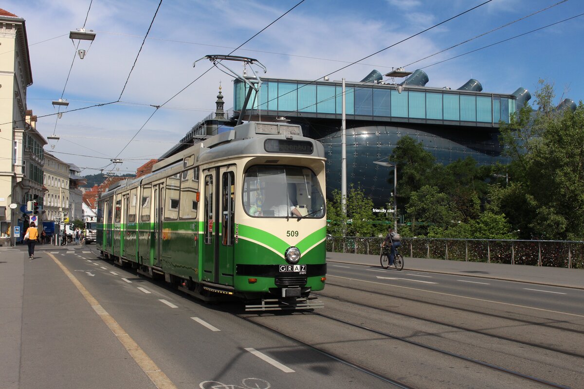Am Vormittag des 7.6.2022 fährt der SGP Wagen Nr. 509 auf der Linie 4 von Reininghaus nach Liebenau. Max Kiegerl