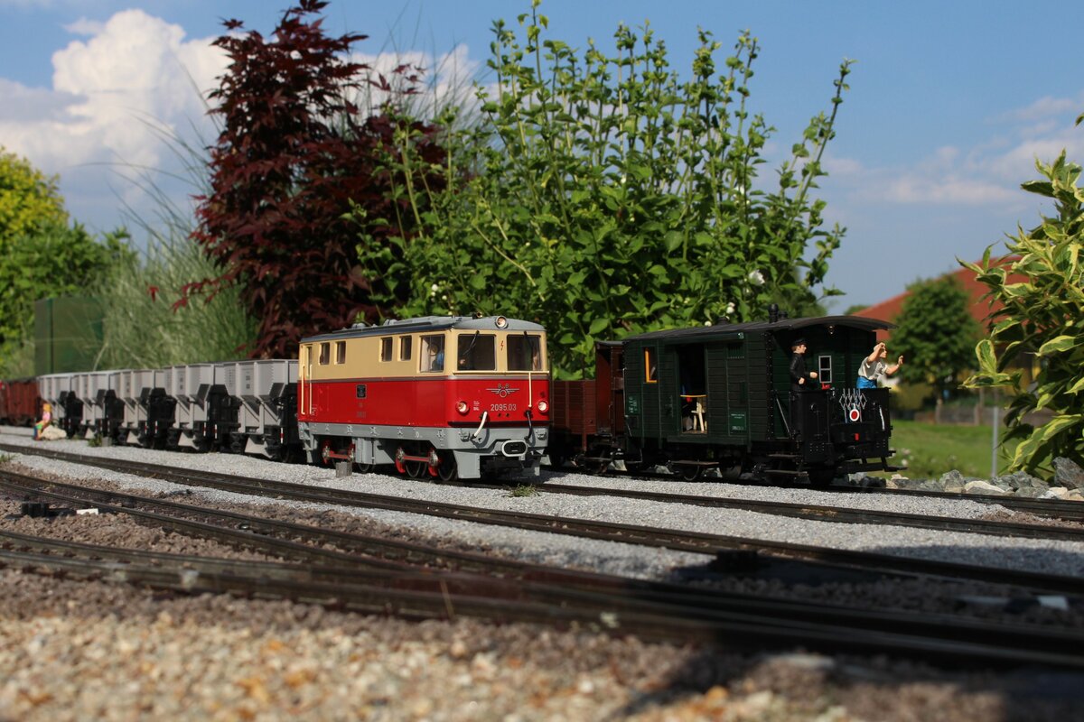 Während die 2095.03 als Arbeitszuglok mit einem leeren Schotter auf die Abfahrt zum Steinbruch bei Strauchbach wartet, fährt am 27.5.2022 der nachmittägliche Fahrverschubzug aus Trassdorf in den Bahnhof Brunn am Berg ein. Max Kiegerl
