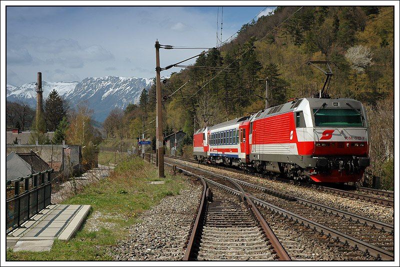 1014 012 + Messwagen + 1014 010 als SPORB 94052 von Eichberg nach Gloggnitz bei der Durchfahrt der Station Schlöglmühl. Im Hintergrund ist die Rax zu sehen.