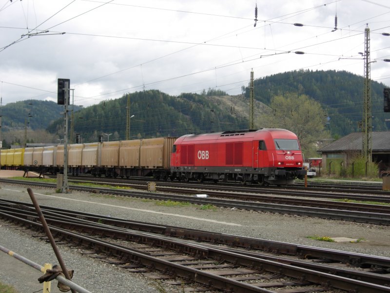 Eine ÖBB BR 2016 steht mit einem Güterzug in Knittelfeld und fährt in wenigen Minuten über Zeltwerg,(Lavanttalbahn), Frantschach nach Wolfsberg. Am 23.04.08
