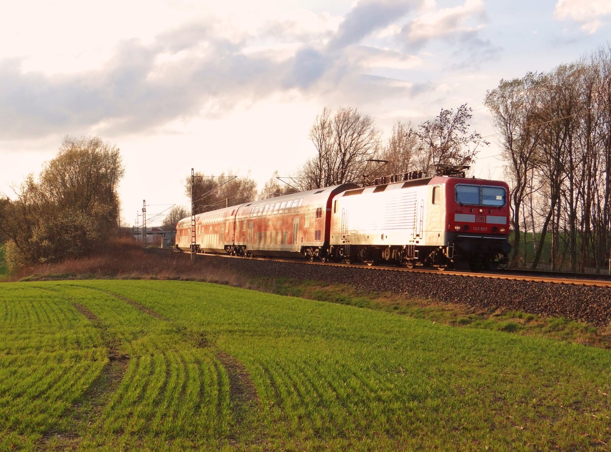 Am 06.04.2016 ist 143 821-7 mit ihren RE zwischen Glauchau und Zwickau, hier am Bahnhof Mosel unterwegs.