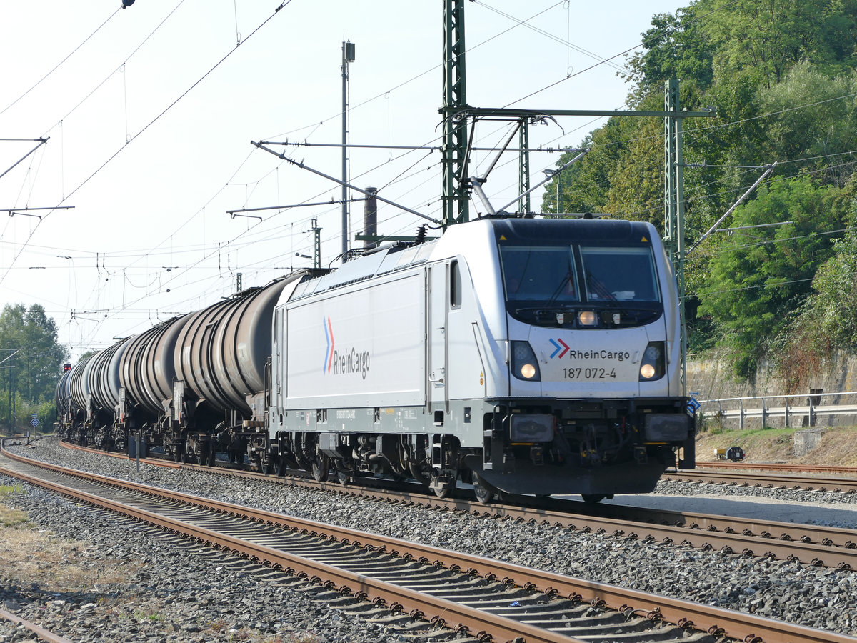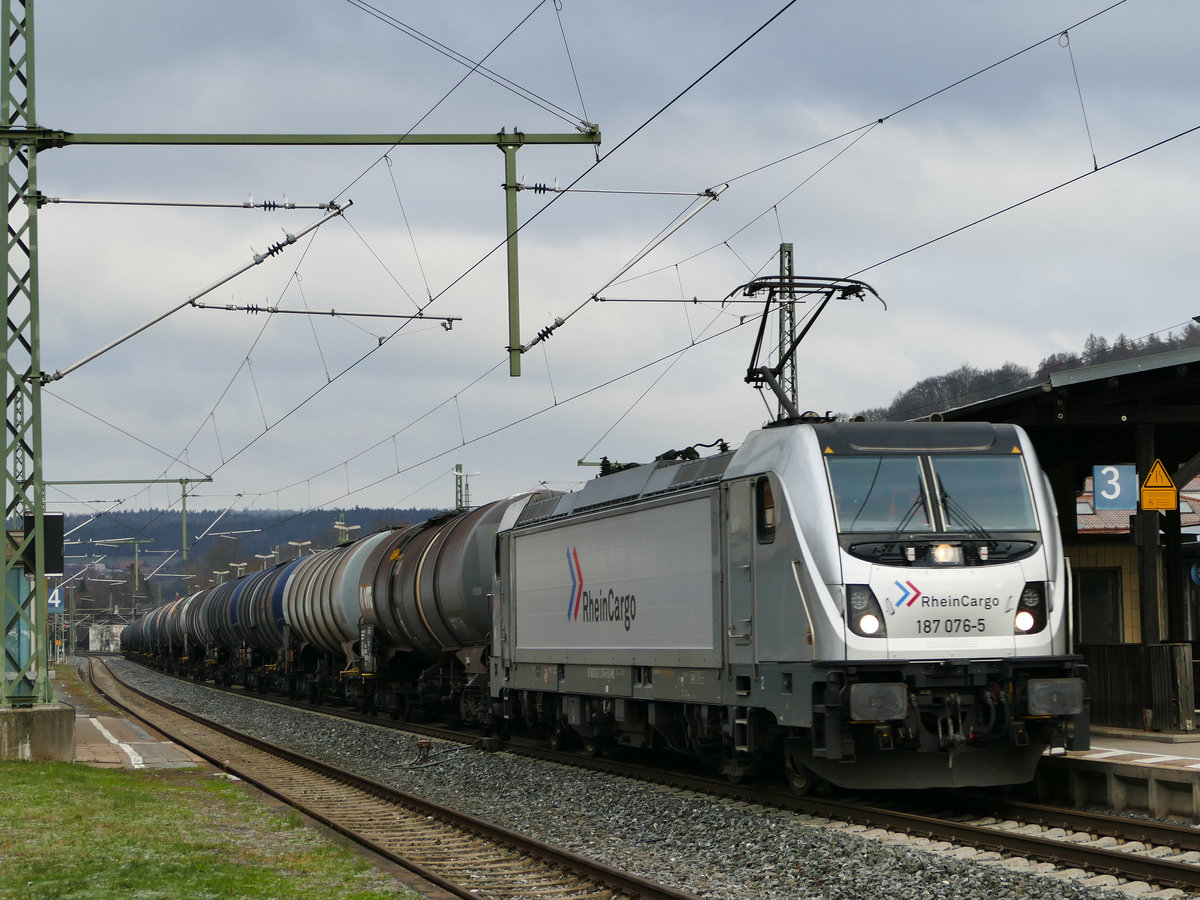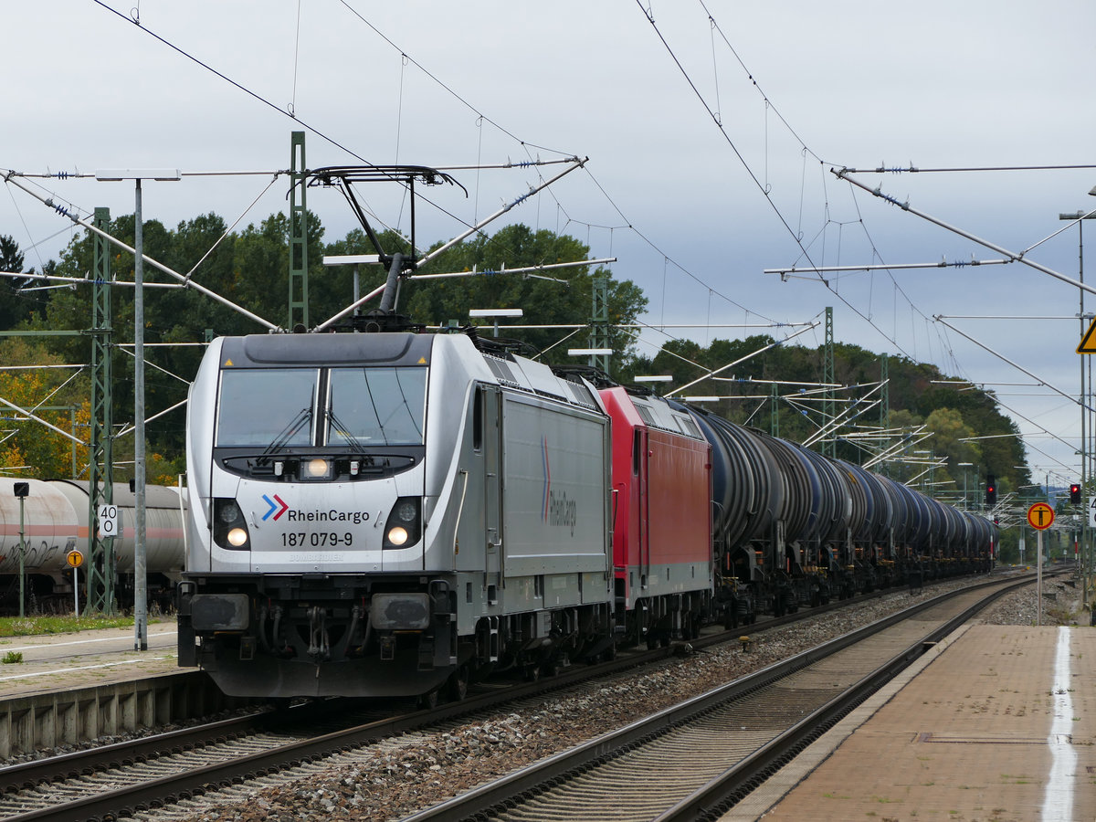 01. Oktober 2019, Ein Kesselwagenzug, geführt von Lok 187 079, fährt durch den Bahnhof Hochstadt-Marktzeuln in Richtung Saalfeld. Die zweite Lok ist 185 605. Jürgen Krause