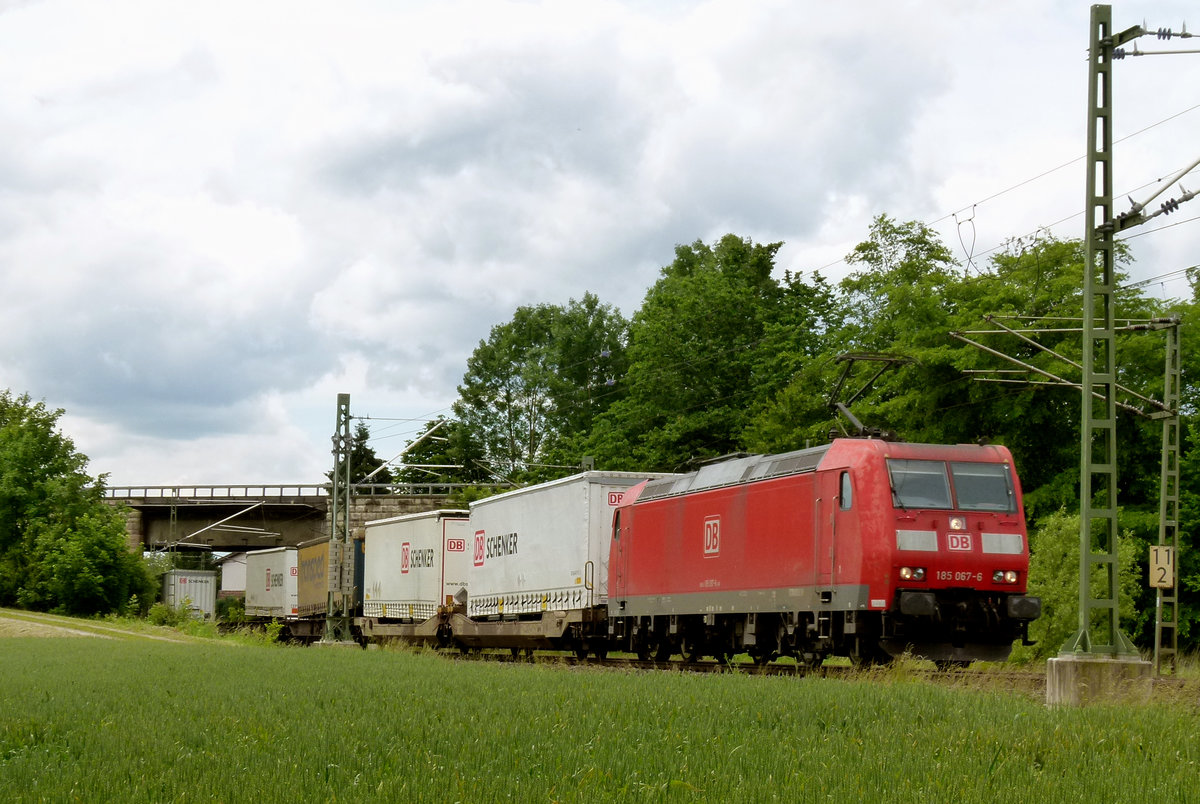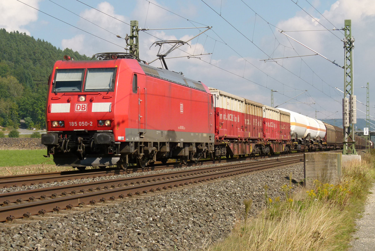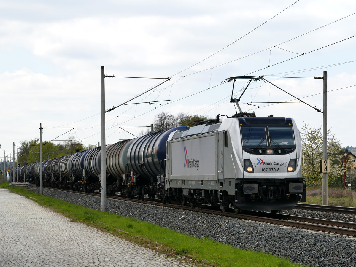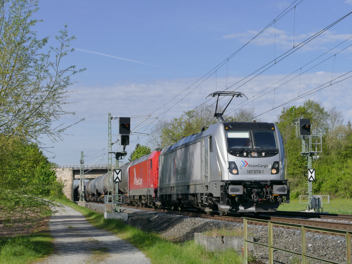 11. Mai 2017, Ein Güterzug fährt bei Johannisthal in Richtung Saalfeld. Zuglok ist 187 078, dahinter läuft 185 604. Beide gehören zur RheinCargo. Jürgen Krause