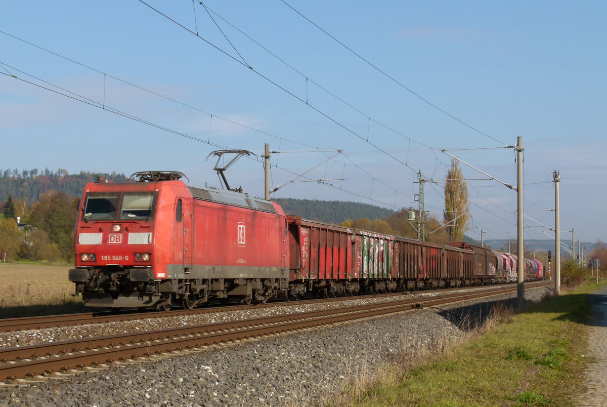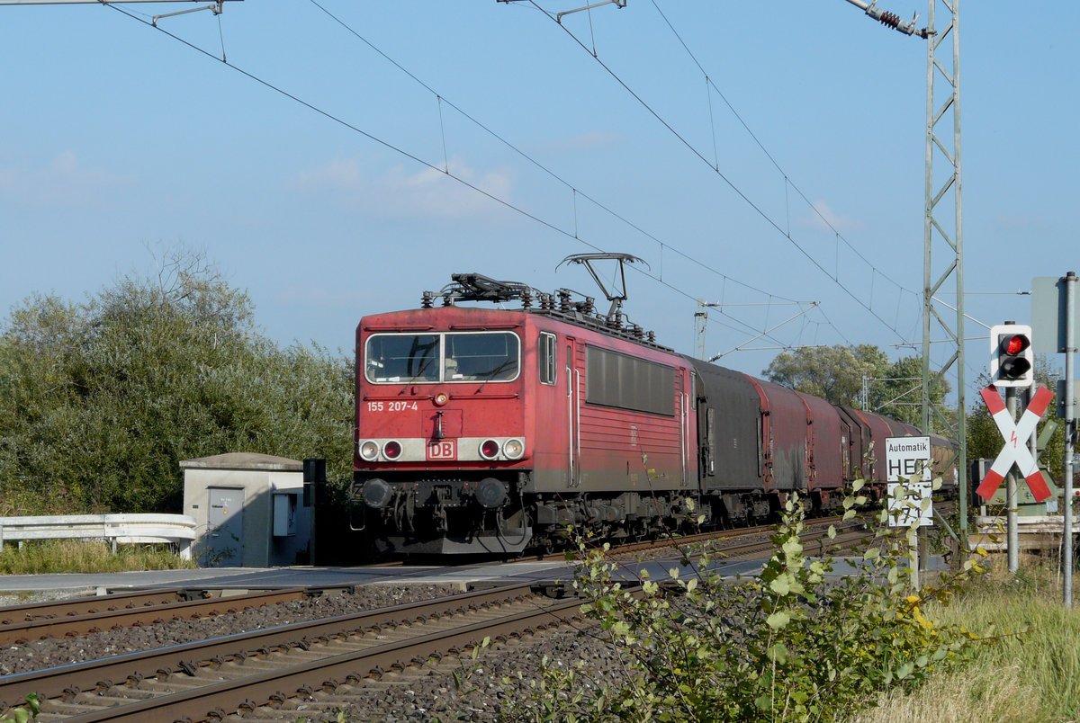 16. Oktober 2010, Bei Oberlangenstadt fährt Lok 155 207 mit einem Güterzug in Richtung Lichtenfels. Der beschrankte Übergang am ehemaligen Haltepunkt ist mittlerweile einer Brücke gewichen. Jürgen Krause