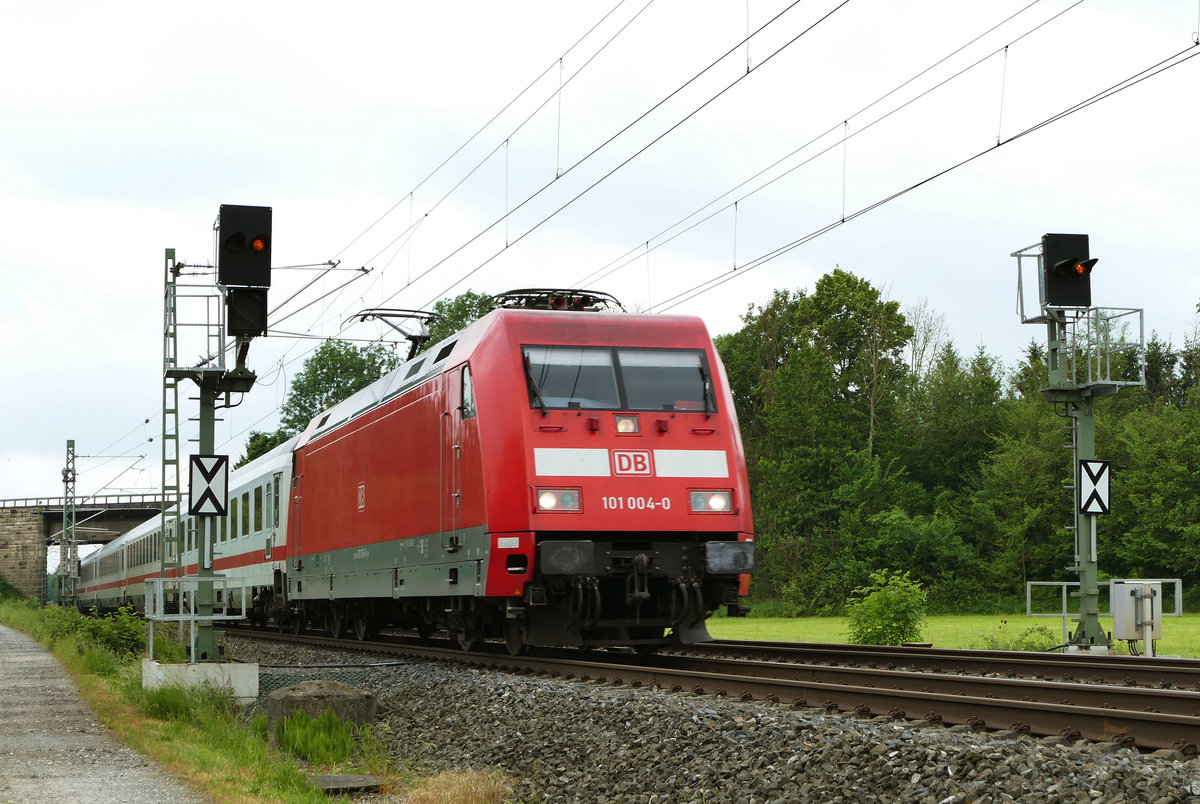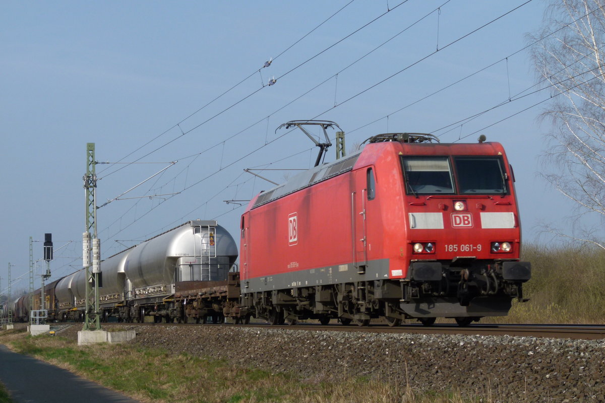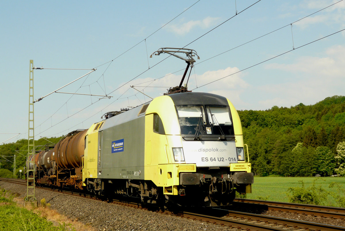 13. Mai 2008, Am Wegübergang Oberlangenstadt fährt Lok Es 64 U2-014 (182 514) mit einem Kesselwagenzüglein in Richtung Saalfeld. Hatte bei der Zusammenstellung des Zuges jemand Angst vor den Höhen des Frankenwaldes? Jürgen Krause