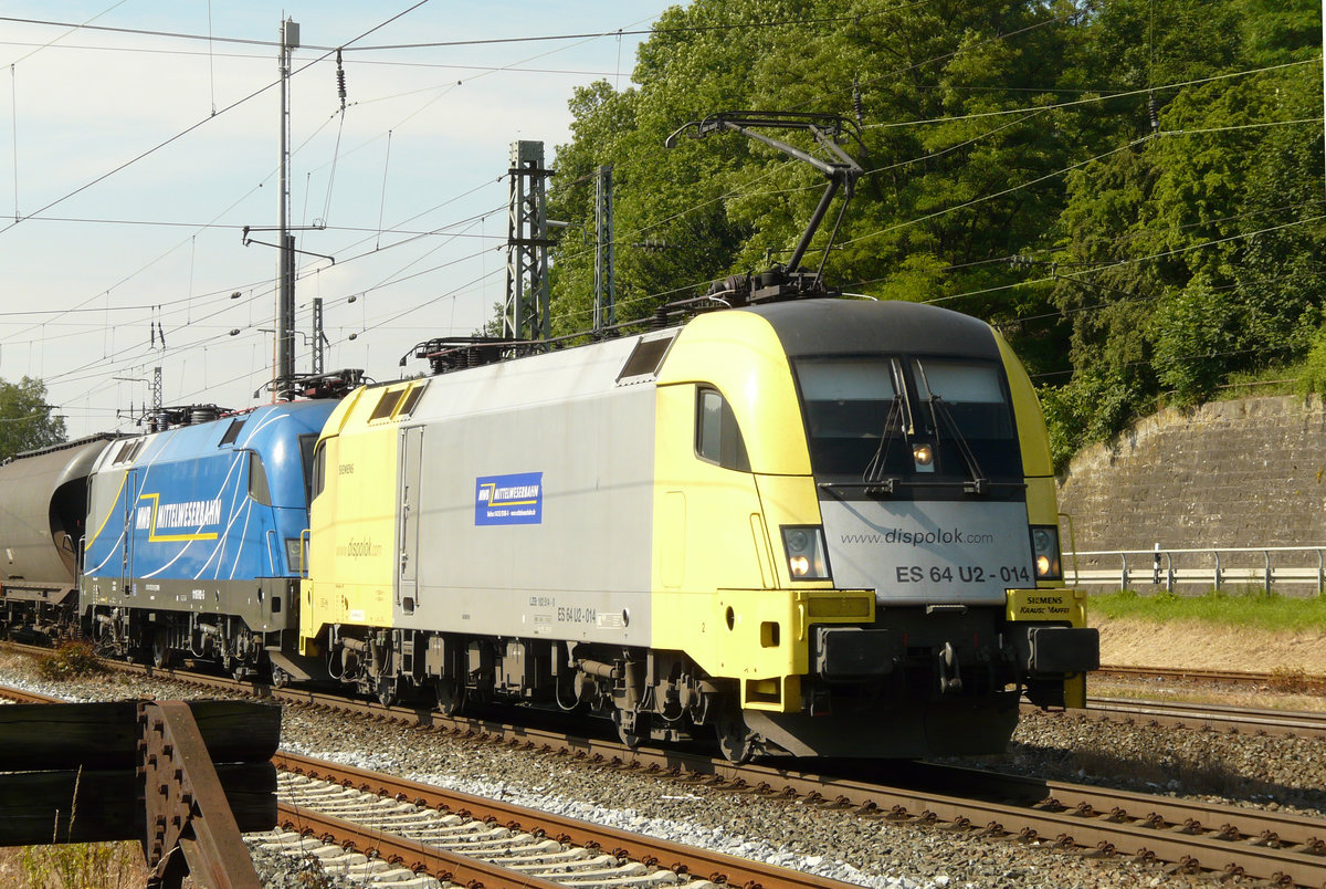 17. Juni 2008, Bahnhof Kronach, am Stellwerk Süd: Ein Güterzug in Richtung Saalfeld wird von der Siemens-Dispolok ES 64 02-014 (182 514) und der in Diensten der Mittelweserbahn stehenden 1116 912 gezogen. Jürgen Krause