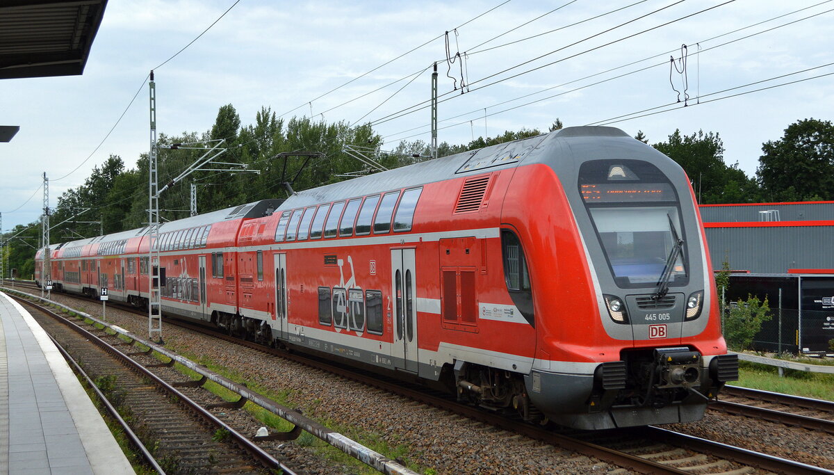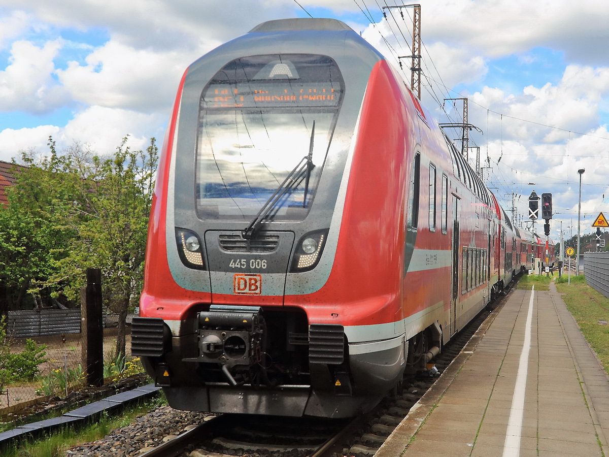 Einfahrt 445 006 / 445 002 als RE 5 (4359) von Elsterwerder in den einzigen Bahnsteig des für längere Zeit in Umbau befindlichen Bahnhof Wünsdorf-Waldstadt am 17. Mai 2021. Klaus-P. Dietrich