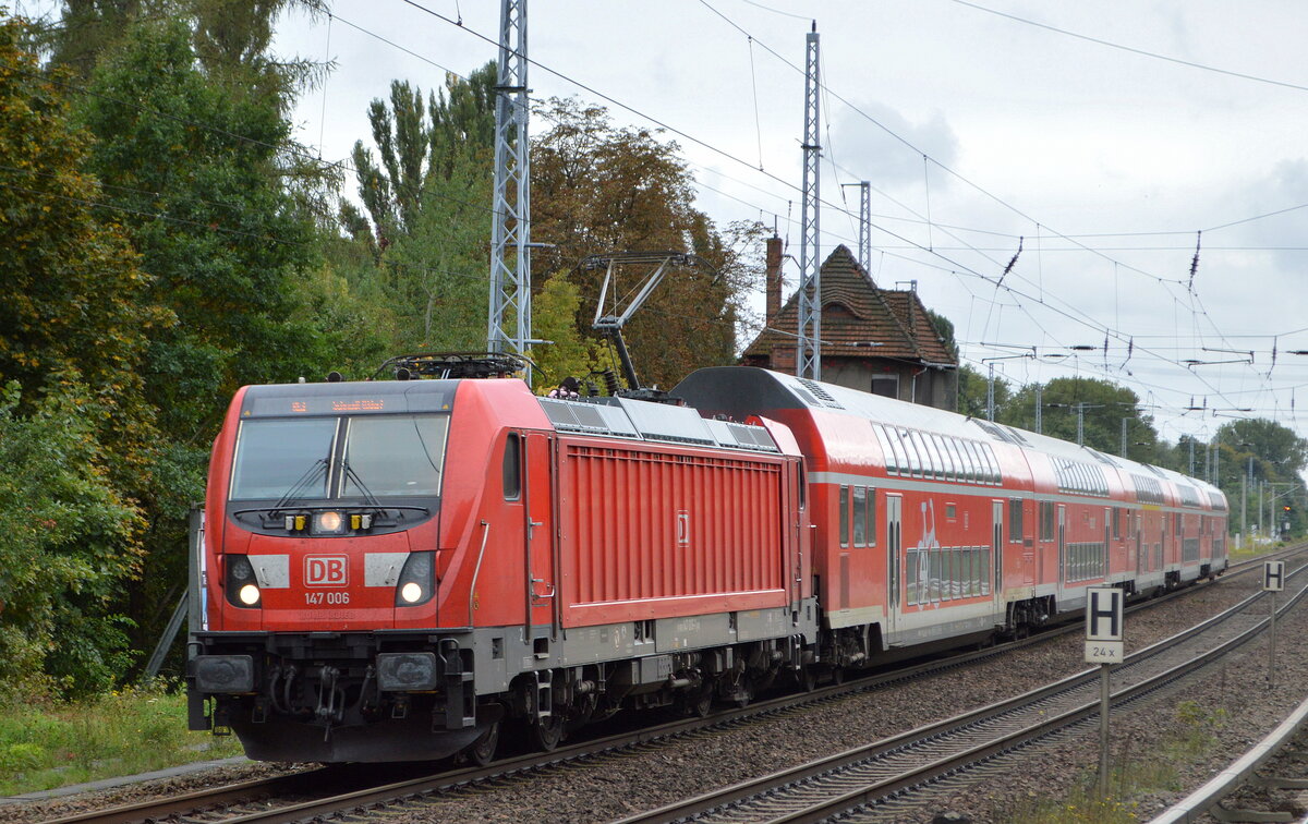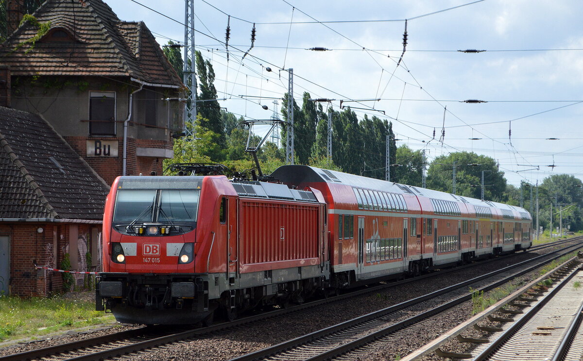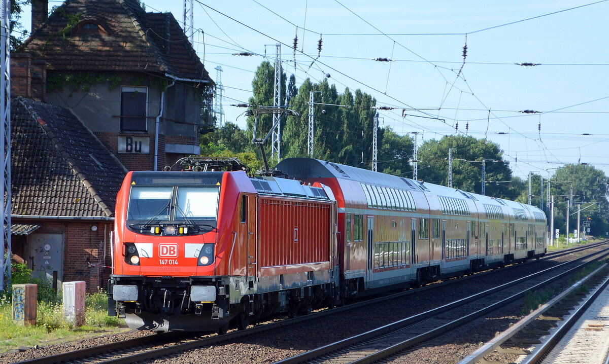 DB Regio Nordost mit dem RE3 mit "147 014" [NVR-Nummer: 91 80 6147 014-5 D-DB] am Streiktag dem 12.08.21 trotzdem auch im Einsatz, natürlich nicht ganz so regelmäßig wie an regulären Wochentagen, aber er fuhr in beiden Richtungen mehrmals an diesem Vormittag. Lothar Stöckmann