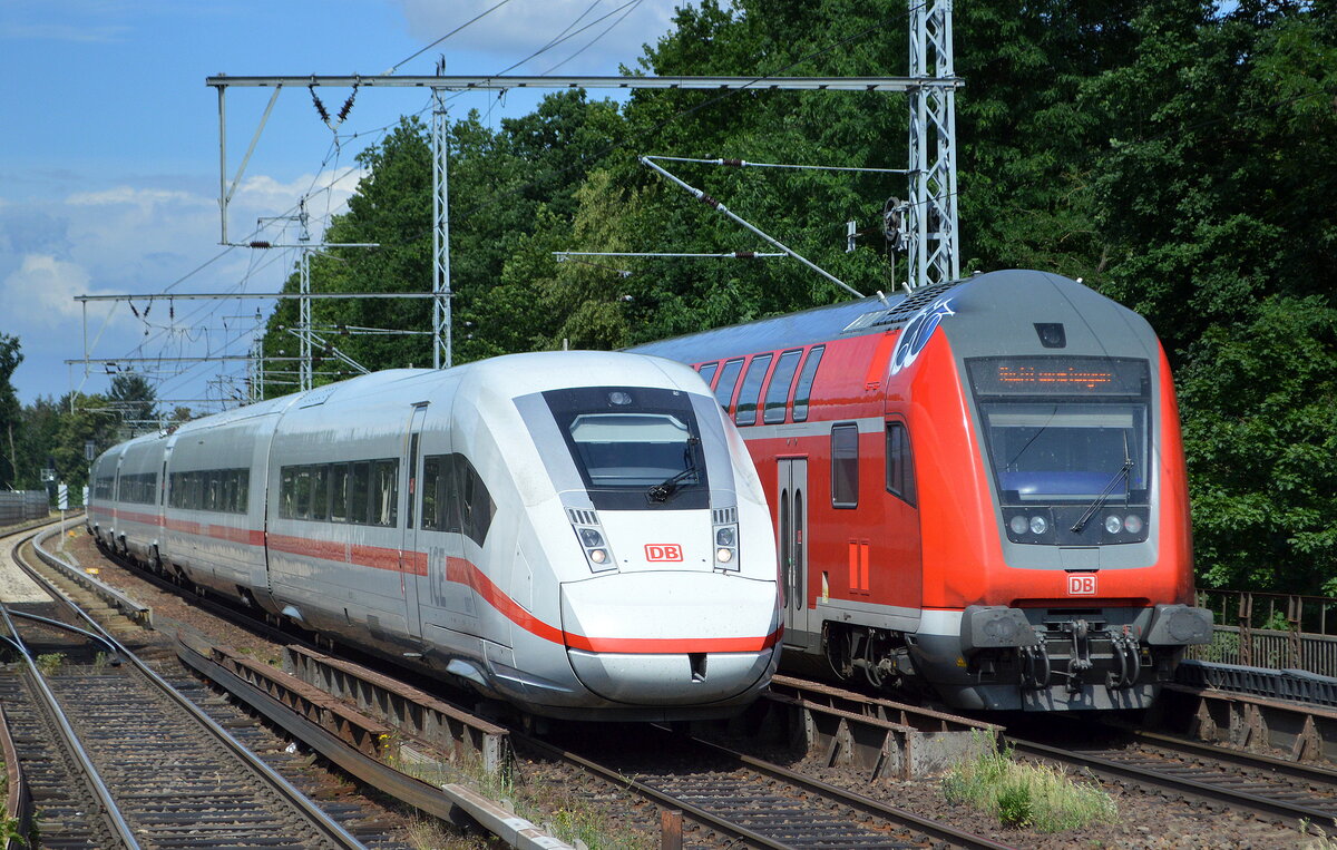 ICE 1040 aus dem Ostseebad Binz mit dem ICE 4 Tz "9217" Richtung Berlin Gesundbrunnen und Begegnung mit dem RE3 Richtung Eberswalde am 02.07.21 Berlin Buch. Lothar Stöckmann