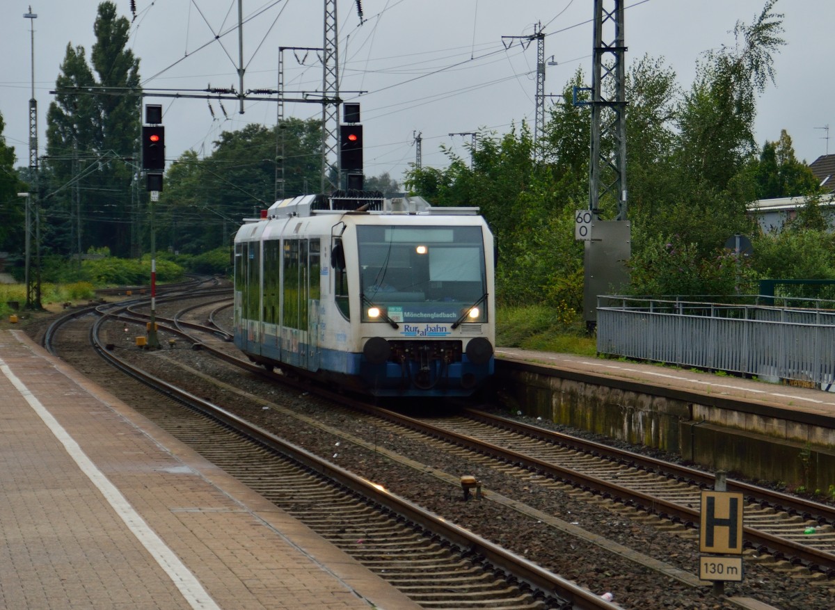 Ein von "Malern" versauter mir unbekannter Triebwagen der RurTalBahn ist hier in Rheydt an der Hohlstraße gen Rheydt Hbf als RB 39 nach Dalheim unterwegs. 1.8.2014 Andreas Strobel