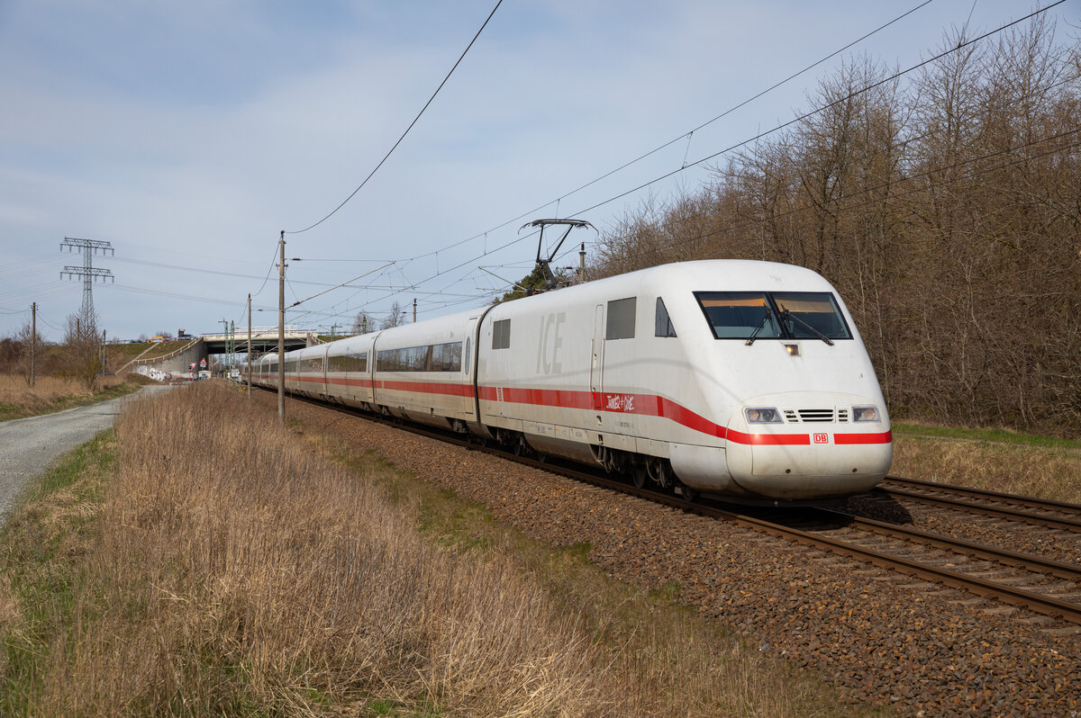 Im Blockabstand folgte dieser ICE 1 am 11.3.2023 als Leerzug einem planmäßig voraus fahrenden ICE 4 in Richtung Münster. Um 9.59 Uhr verläßt er hier gerade Niedersachsen am Ortsrand von Hasbergen. Erstmals war an diesem Ort ein Winterfoto mit Schnee möglich. Bisher war dieser an Hasbergen vorbei gezogen. Gerd Hahn