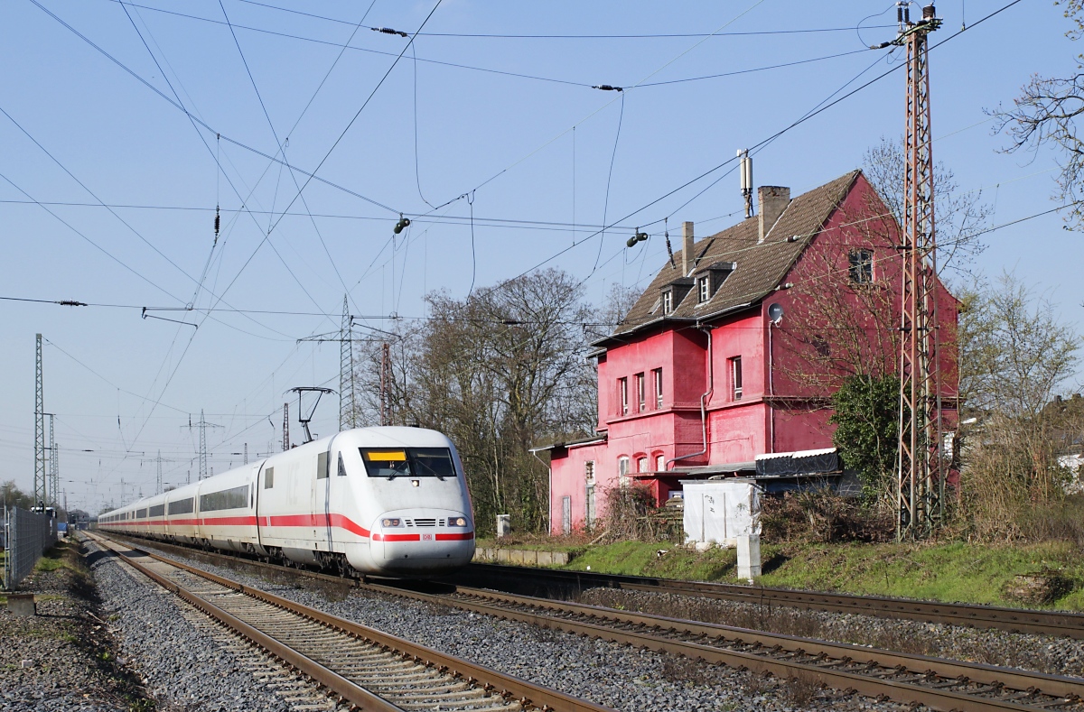 Seit der jetzt schon 40 Jahre zurückliegenden Einstellung des Personenverkehrs zwischen Düsseldorf-Rath und Duisburg-Wedau verkehren Personenzüge nur noch in Ausnahmefällen, z. B. bei Bauarbeiten oder Betriebsstörungen auf der Hauptstrecke zwischen Düsseldorf und Duisburg, über die Güterzugstrecke Mülheim-Speldorf–Troisdorf. Am 05.04.2023 benutzte der ICE 929 (Dortmund - Passau), der momentan wegen Bauarbeiten zwischen Dortmund und Düsseldorf umgeleitet wird, die Ausweichroute, hier bei der Durchfahrt des ehemaligen Bahnhofs Lintorf. Gruß zurück an den Tf! Horst Lüdicke