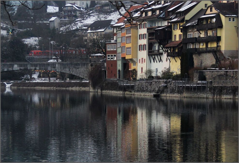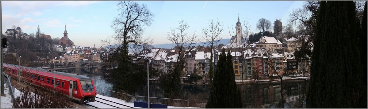 Laufenburg am Hochrhein - Während dieser Aufnahmestandpunkt sich auf Schweizer Boden befand, verläuft die Bahnstrecke auf deutschem Gebiet; Januar 2017 Stephan Kainberger