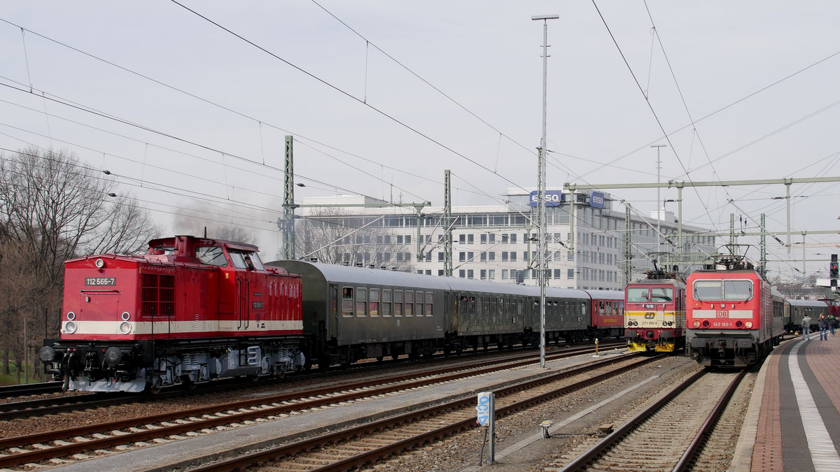 112 565 mit dem LDC-Sonderzug DPE 20108 nach Altenberg, die am Bildrand zu sehende 143 193 hat als Ersatz für die 35 1019 den Sonderzug DPE 20104 von Cottbus bis Dresden Hbf. gebracht; 25.03.2017