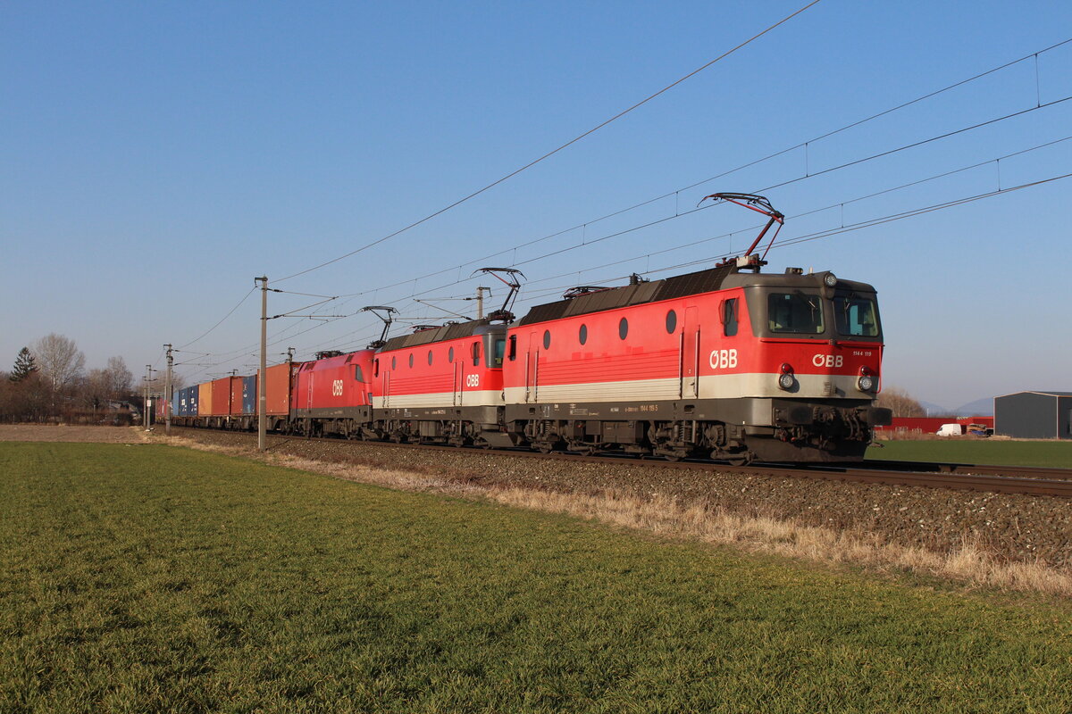 Kurz vor dem Zentralverschiebebahnhof Wien Kledering auf der "Klederinger Westschleife" ist am 11.3.2022 der KGAG43680 von Koper tovorna nach Žilina-Teplička zum Stehen gekommen. In Kledering verliert der Containerzug die 1144 119 und 1144 275 und die 1116 098 bringt den Zug alleine nach Bratislava-Petrzalka.