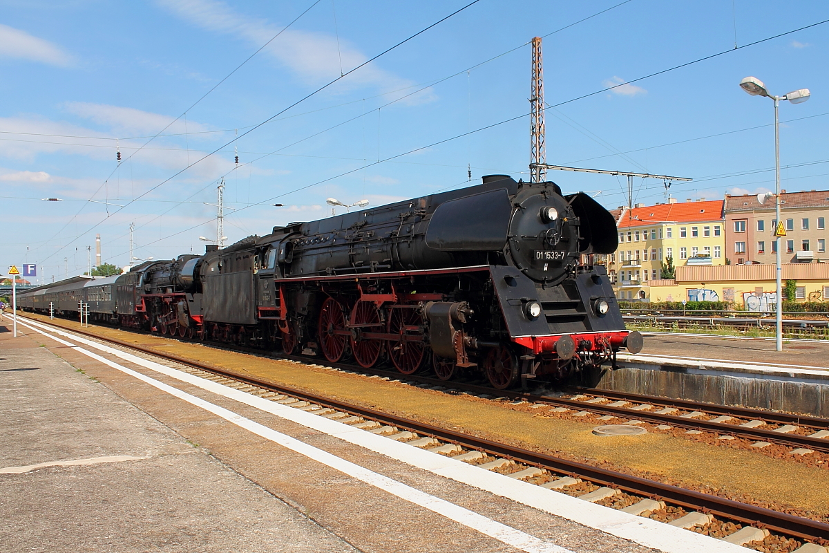 Der SDZ 20323 mit der Vorspannlok 01 1533-7 der ÖGEG und der Zuglok 03 2155-4 der WFL trifft am 01.08.2015 mit dem Dampfsonderzug durch Deutschland auf seiner zweiten Etappe von Dresden nach Berlin in Berlin-Lichtenberg ein.