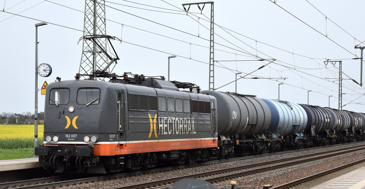 Hector Rail (Germany) GmbH, Bochum mit ihrer "162.007", Name: "Beckert" (NVR: "91 80 6151 134-4 D-HRDE") und einem Kesselwagenzug am 09.04.24 Höhe Bahnhof Rodleben. Lothar Stöckmann