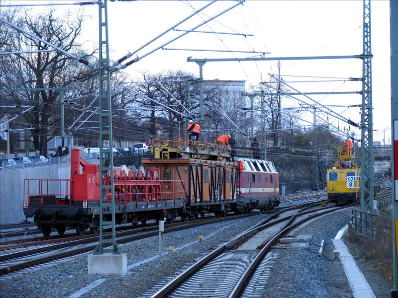Westseite Dresden Hbf.: 5250.05-5 von arco TRANSPORTATION und ein FMW, eingesetzt bei der Montage der Fahrleitung über den neuen Gleise für Güterzüge; auf dem letzten Wagen sind die Kabelrollen mit dem Kupferdraht; 26.11.2007