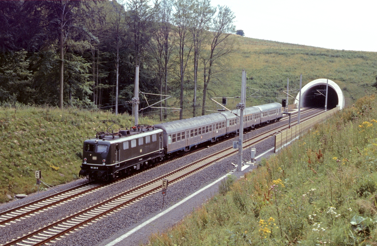 Nein, kein Schnellfahrversuch mit 132 035 auf der Schnellfahrstrecke nördlich Kassel. Während der Sanierung der alten Trasse Kassel - Eichenberg im Bereich Kragenhof wurde die in diesem Bereich bereits fertige SFS zur Umleitung benutzt (3.7.1990). Markus Engel