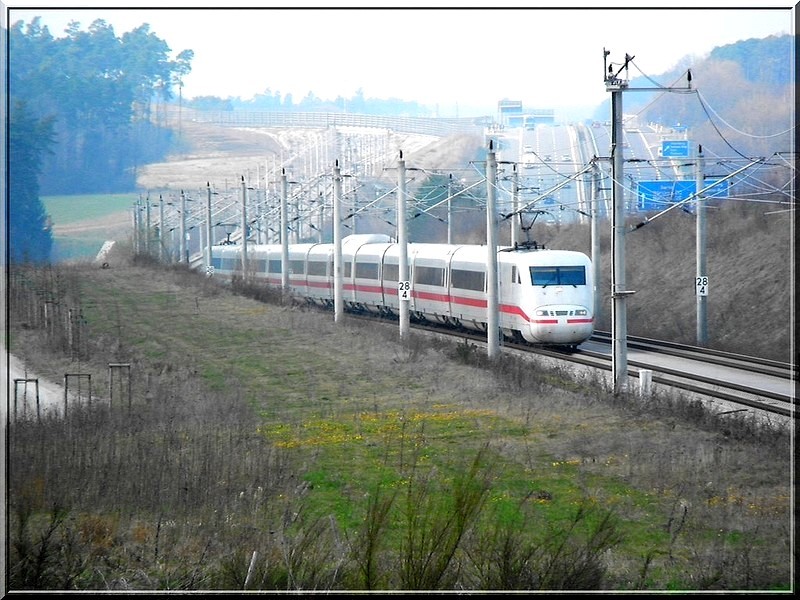 Der ICE S rast auf der Hochgeschwindigkeitsstrecke von Nürnberg nach München am 31.7.2008. Aufgenommen von Autobahnraststätte Feucht. Matthias Handschuch