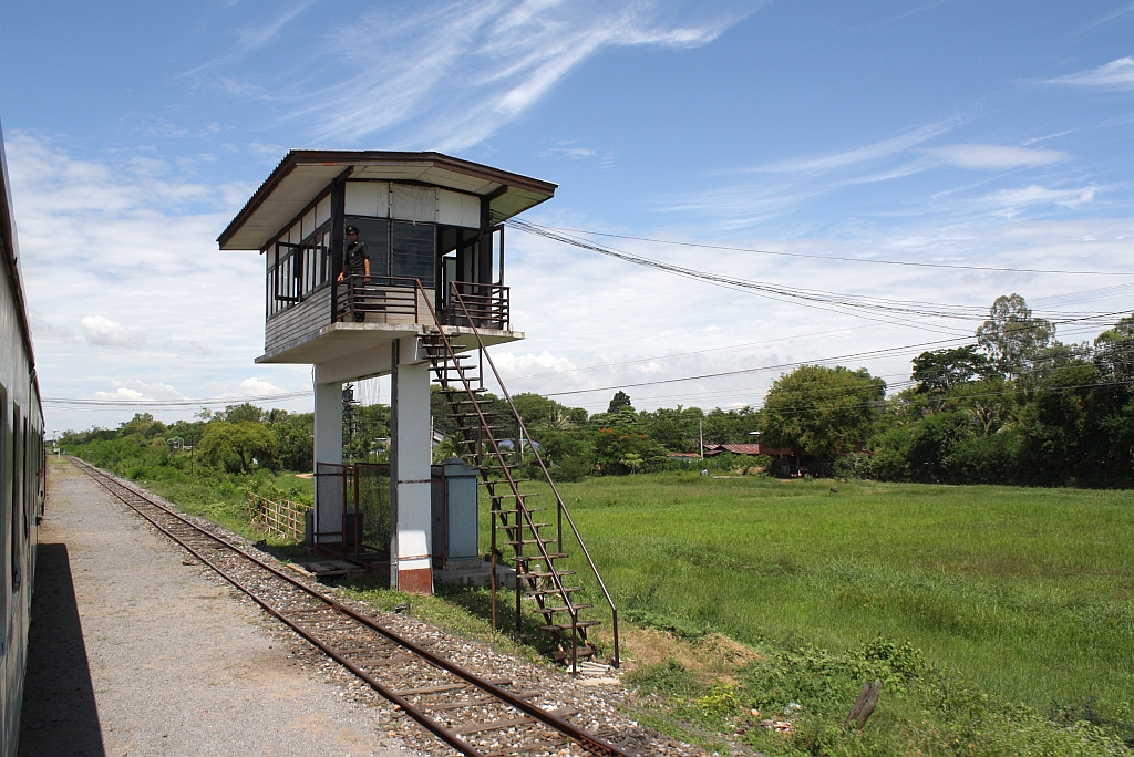 Blick in das am Bahnsteig befindliche Stellwerk des Bf. Pattani (Khok Pho) am 11.Jänner 2012. Noch sind die Seilzughebel in Betrieb, jedoch erkannt man an der neuen Schautafel, daß die Umstellung auf elektr. Signalstellung schon weit fortgeschritten ist. Karl Seltenhammer