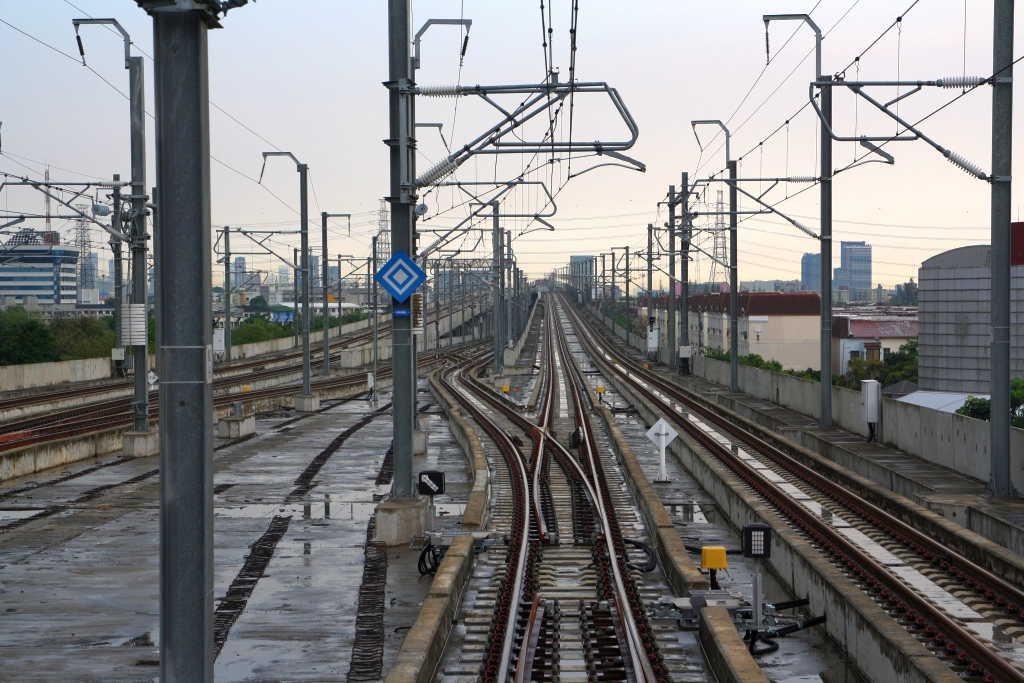 Seit der Inbetriebnahme der Krungthep Aphiwat Station der SRT (vorher Bang Sue Grand Station genannt) am 19.Jänner 2023 werden zwischen Krungthep Aphiwat Station bzw. Nikhom Rotfai Km. 11 Station und Don Muang Station im viergleisigem Abschnitt die beiden inneren Gleise von den Zügen der Northern und Northeastern Line ohne Halt befahren. - Da die Stationen der SRTET Red Lines mit Bahnsteigsperren versehen sind, jene der SRT Northern und Northeastern Lines jedoch frei zugänglich sind wurden die Don Muang und Rangsit Station in zwei Ebenen errichtet. - Das Bild vom 28.April 2023 (aufgenommen durch die Stirnwandtüre des letzten Wagen des ORD 207) zeigt die Auslösung der SRT-Strecke aus dem viergleisigen Abschnitt vor der Don Muang Station.
