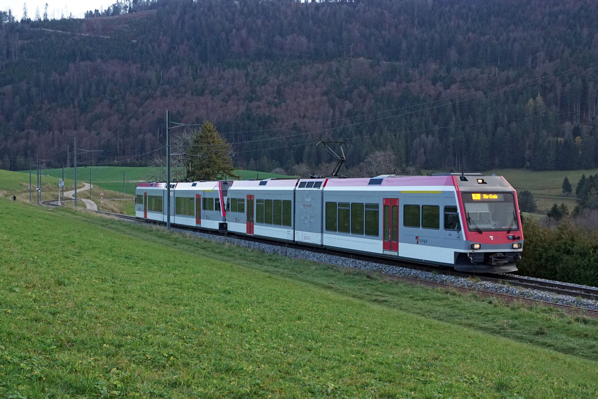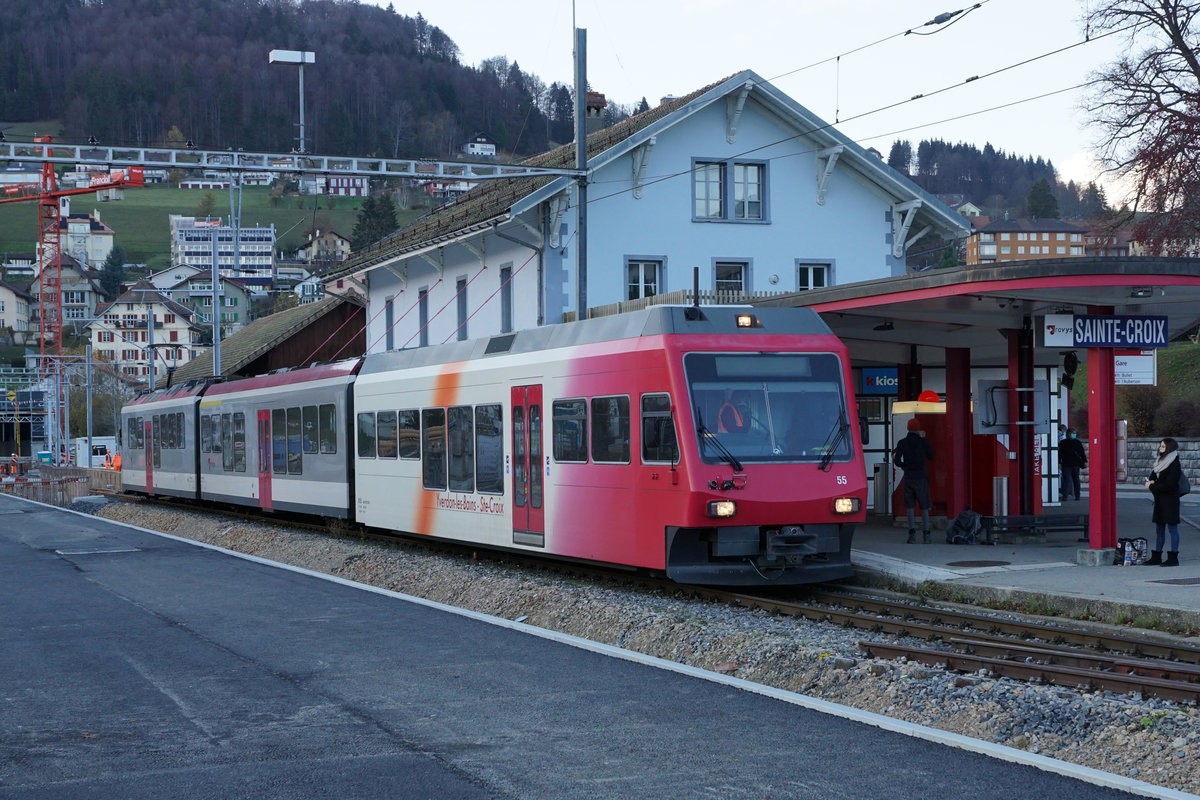 Ein neuer Pendelzug Be 4/4 + AB + Bt 51 (unpassend) in Ste. Croix.