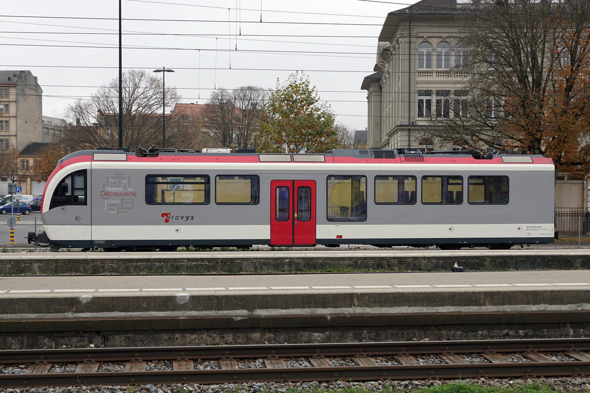 Ich hatte "meinen" ex CEV/MVR GTW 2/6 gesehen aber nicht fotografiert, doch bei der Rückfahrt kam ich dann doch noch zu einem GTW Bild: am abgestellten TRAVYS ABe 2/6 2000 vorbeifahrend erreicht der TRAVYS GTW ABe 2/6 2001 (90 85 8272 001-1) als Regionalzug von Vuiteboeuf nach Yverdon sein Ziel.