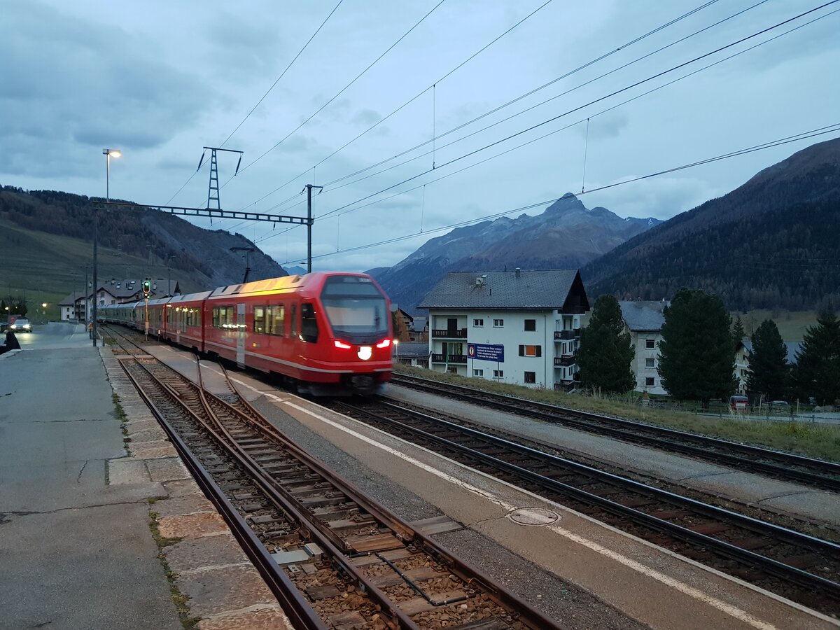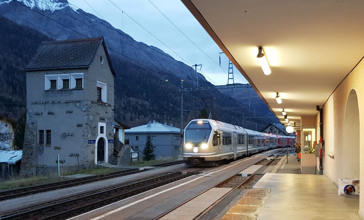 RhB Engadinerbahn__“Capricorn“ ABe 4/16 Tw 3133, wohl der einzige Champagner-farbene der Baureihe, im Bf. Zuoz. Die drei recht jungen Angestellten im Fahrdienstraum, die das historische Gebäude permanent im Blick haben, fragte ich vergebens nach dessen (ursprünglichem) Zweck: "Es sei der alte Turm vom früheren Bahnhofvorsteher...". Tja. __03-11-2022 Klaus-Erich Lisk