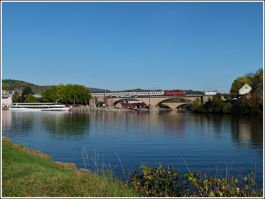 Hier befährt der IC 134 Norddeich/Mole - Luxemburg aus Trier kommend die Moselbrücke bei Konz. In wenigen Kilometern erreicht der Zug die Grenze zu Luxemburg.