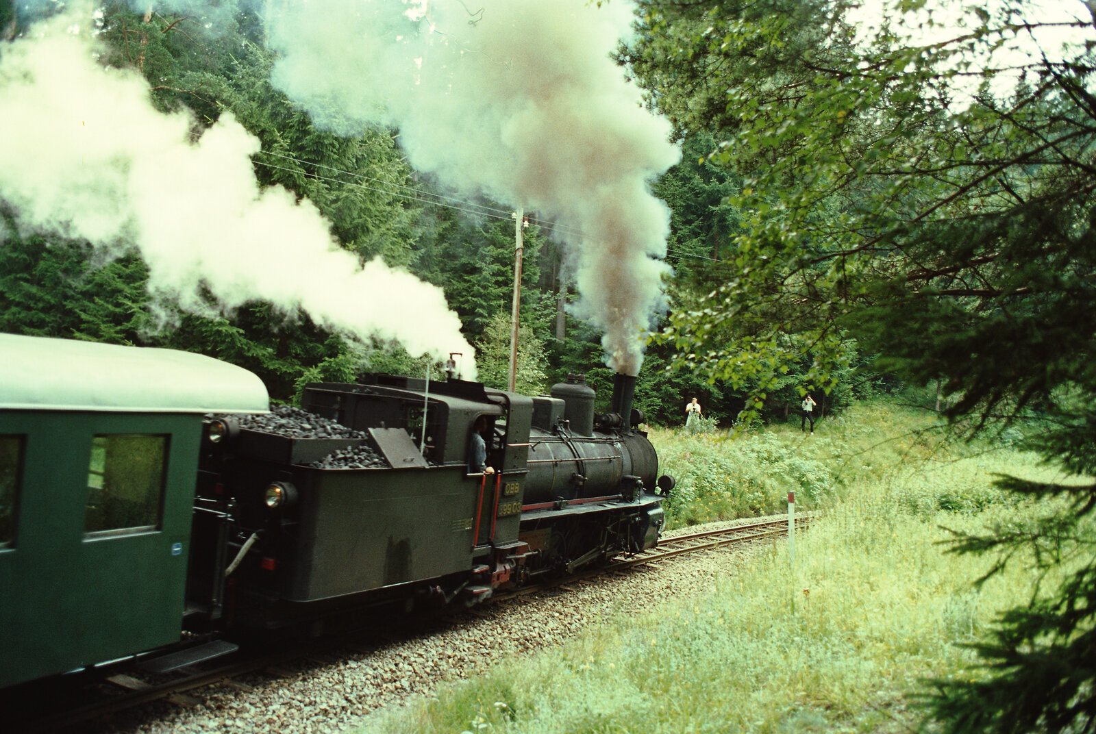 Scan vom Dia: 399.03 hat mit einem GmP (Güterzug mit Personenbeförderung) gerade den Endbahnhof Heidenreichstein erreicht. (17.07.1984) Erwin Schidlofski