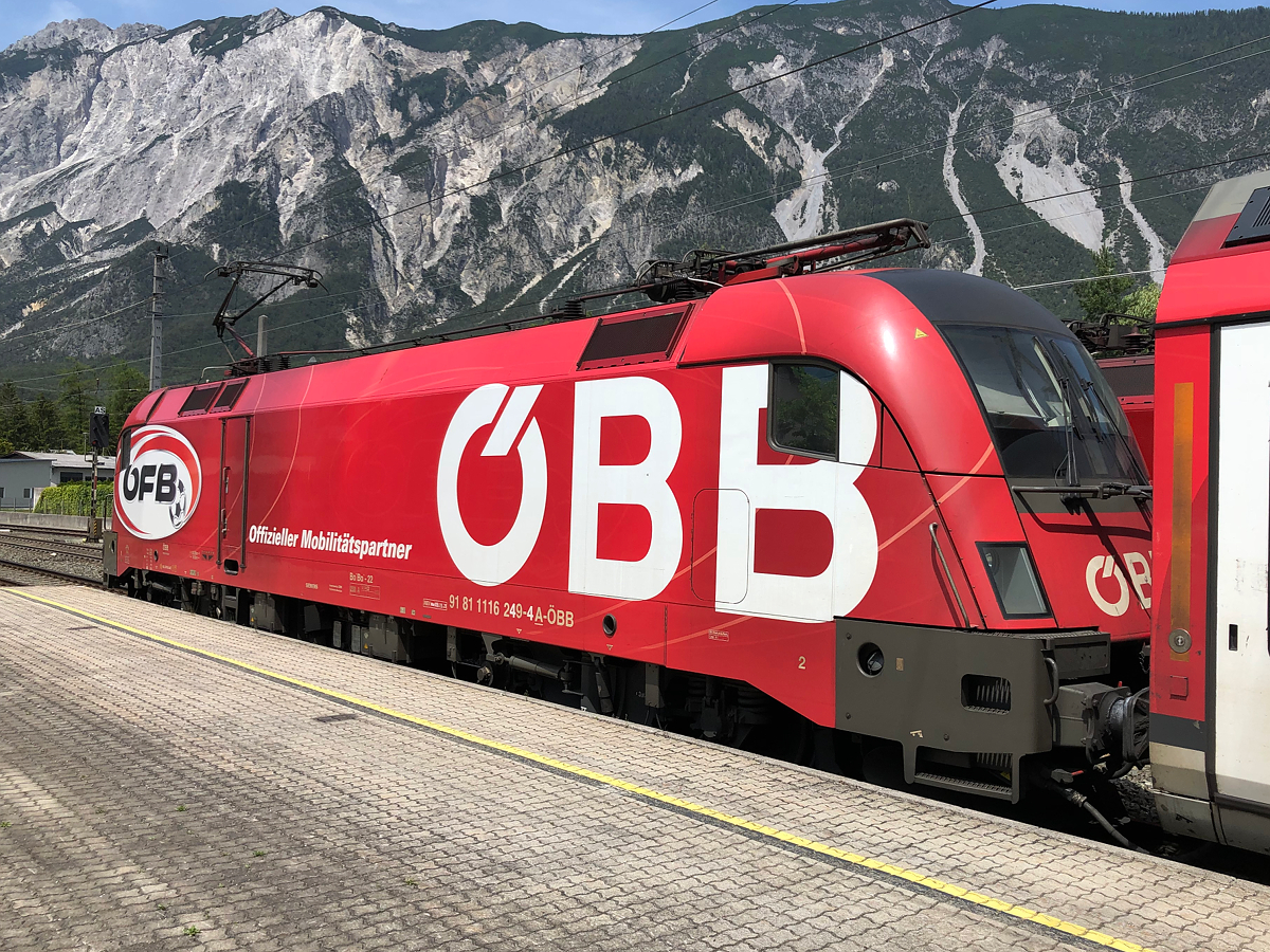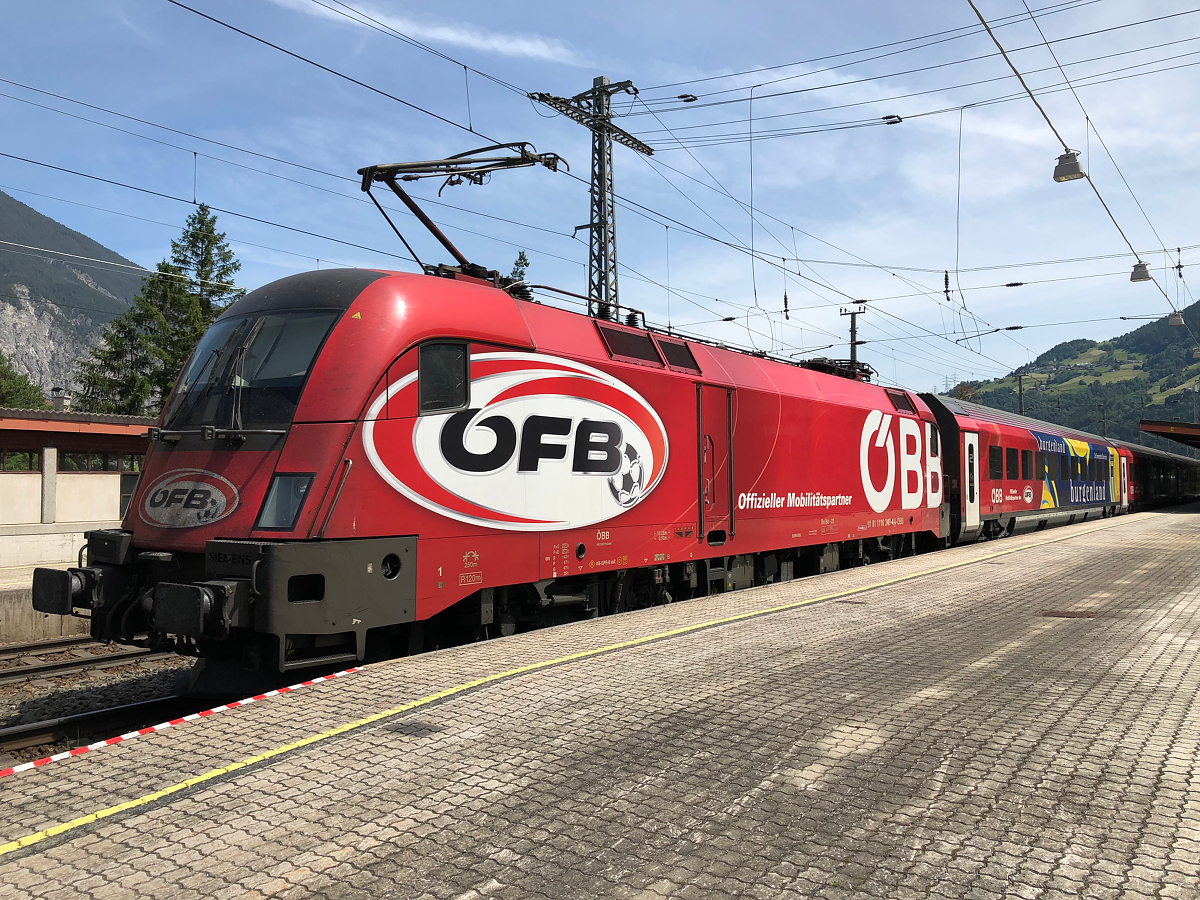 1116 249 im "ÖFB" Design hing am Zugschluss des RJX 867 von Ötztal-Bahnhof nach Flughafen Wien. Aufgenommen am 16.06.2021 in Ötztal-Bahnhof Christoph Plank