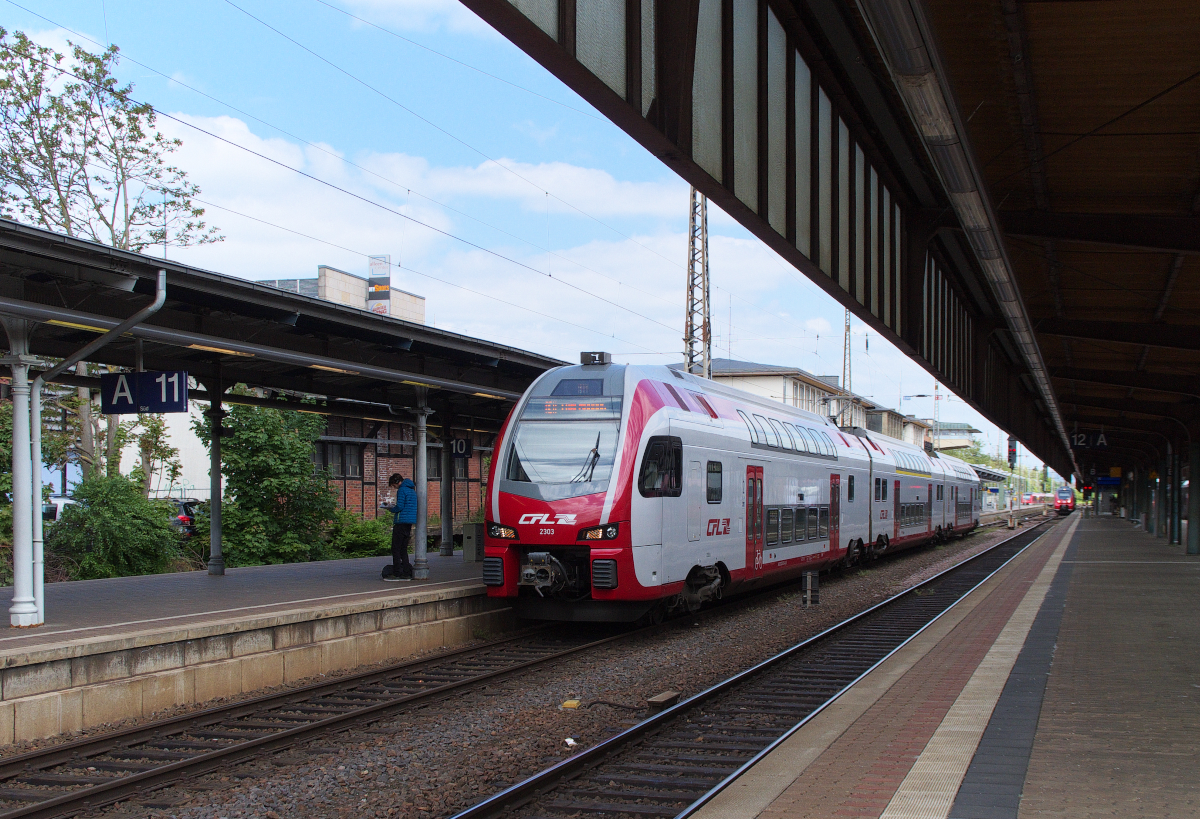 Vom Fernverkehr abgehängt wurde die Relation Luxemburg - Trier - Koblenz seit es den IC Luxemburg Norddeich nicht mehr gibt. Die CFL in Luxemburg hat schnell reagiert und eigene Züge auf der Relation Luxemburg-Koblenz eingesetzt. Zuerst mit Doppelstockwendezügen und seit Dezember 2014 mit den neuen Stadler KISS Doppelstocktriebwagen, die in Trier mit dem SÜWEX aus Mannheim (Kaiserslautern) vereint werden. Nach einigen Schwierigkeiten am Anfang vertragen sich nun die beiden Stadler Triebwagen, der KISS flirtet mit dem FLIRT bei der Annäherung und dann küsst der Flirt den KISS und schon geht es gemeinsam bis Koblenz. CFL 2305 aus Luxemburg fährt am 14.05.2016 in den Hbf. Trier ein. Erhard Pitzius