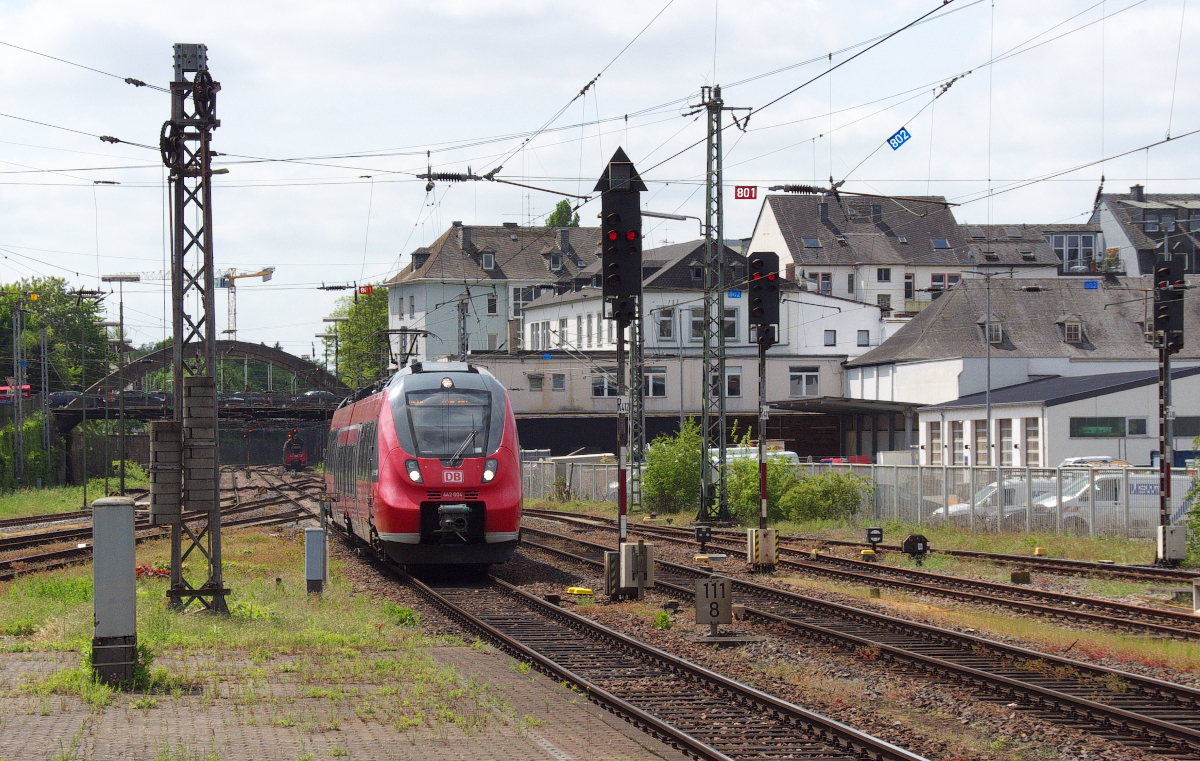 Die Moselstrecke (Bahnstrecke 3010) beginnt in Koblenz und endet auf deutscher Seite in Perl (Saarland) gegenüber von Schengen (Luxemburg). Die Strecke führt noch weiter über Apach an der Mosel entlang und zwar über französisches Gebiet bis Thionville. 442 004 ist auf dem Teilstück der Obermosel zwischen Perl und Trier unterwegs und erreicht gerade Trier Hbf. MO-FR verkehren auch Züge zwischen Perl und Wittlich. Auf der Moselstrecke verkehren die Hamsterbäckchen der Baureihe 442, während von Trier aus über die Saarstrecke nach Saarbrücken die Baureihen 425 und 426 als RB unterwegs sind. 14.05.2016 Erhard Pitzius