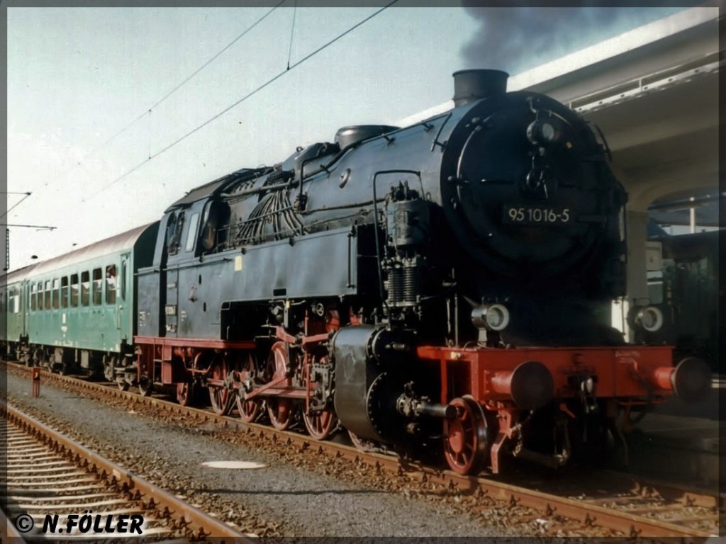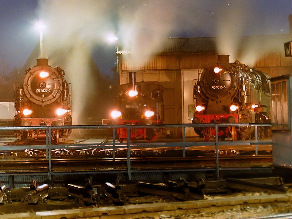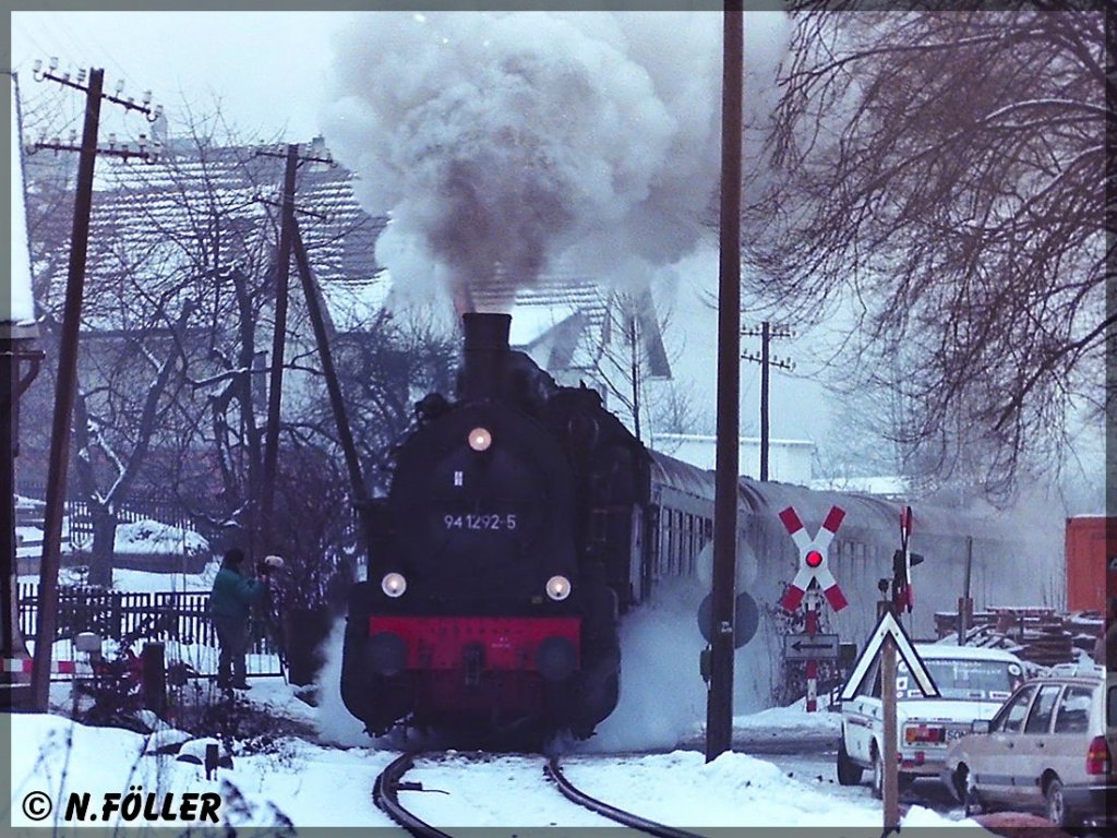 95 1027 mit ihrem Güterzug wird in Steinach von 95 1016 mit einem Personenzug im Februar 1993 überholt