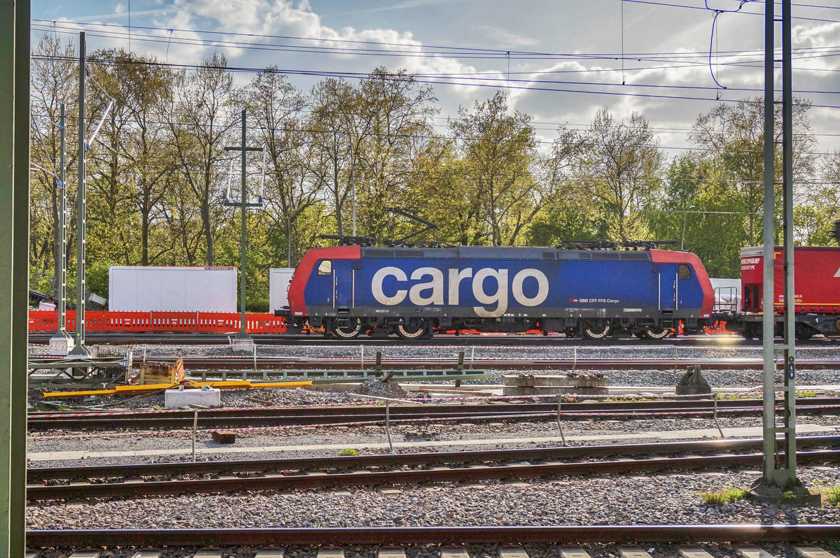 Am 23.05.2017 wartet 425 019 als RB nach Karlsruhe in Mannheim Hbf auf Ausfahrt, während auf den Güterzuggleisen 189 206 in bunter Lackierung mit einem Containerzug vorbeifährt. David Endlich
