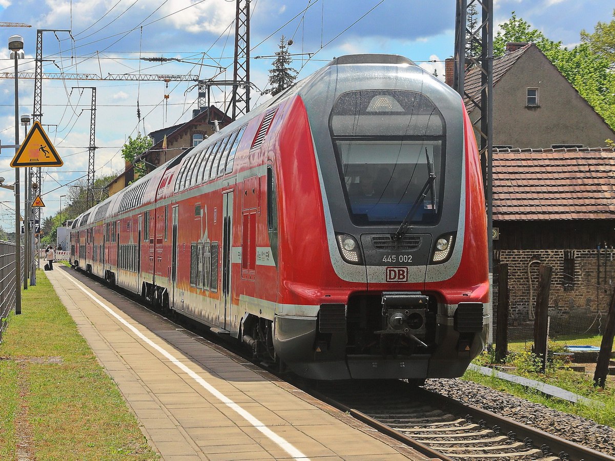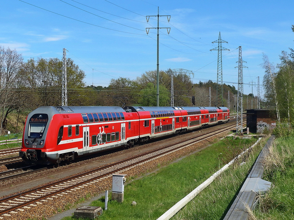 In der Kramerkurve (oder auch "Schweineohr"; Überfahrt von der Anhalter Bahn zum Berliner Außenring) fährt RE 5 (RE 3513) Richtung Wünsdorf-Waldstadt, gezogen von 445 004.