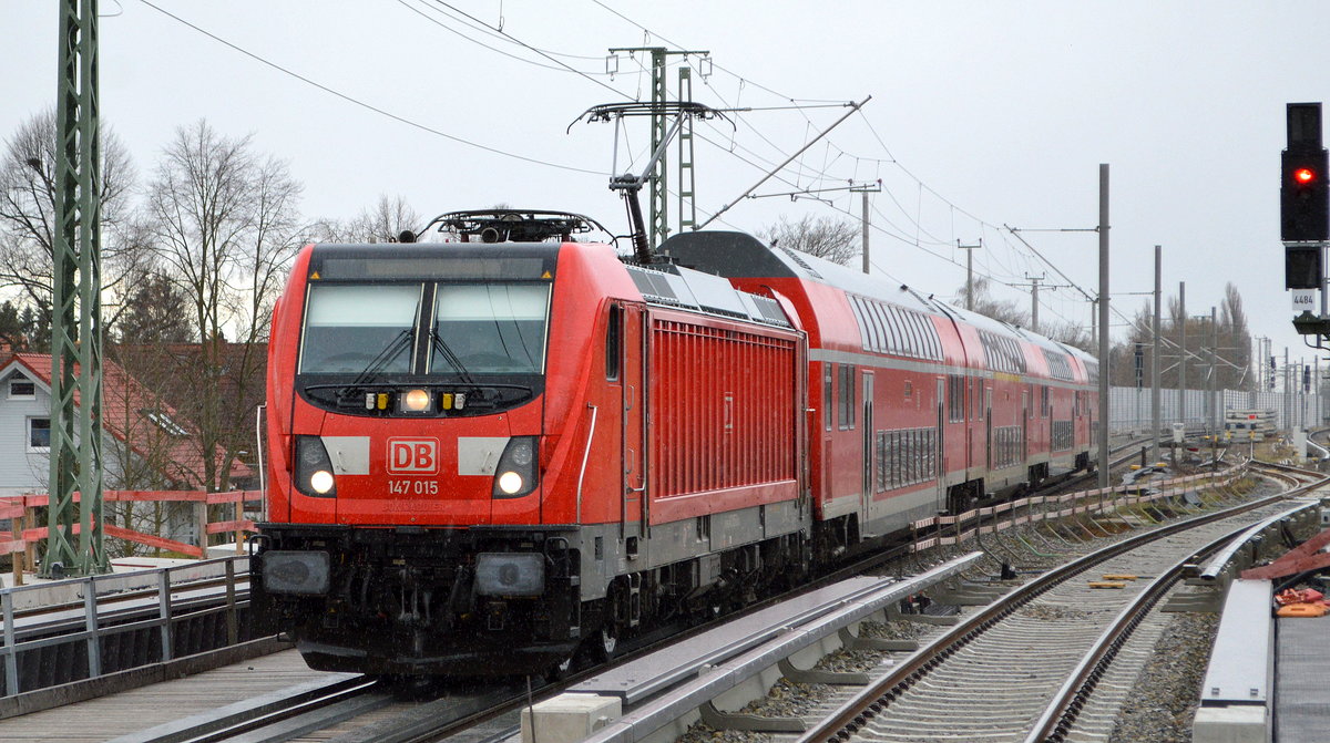 Abendliche Parallelfahrt auf gleicher Höhe mit Lok BR 186 496 und dem Kiss 445.115 der ODEG als RE 4 westwärts unterwegs. Berlin Jungfernheide, aufgenommen im Februar 2021. Lugi