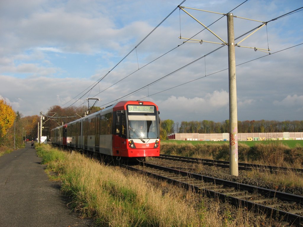 Am Wochenende, 7./8. November 2009, wurde die Strecke der Linie 18 zwischen "Ebertplatz" und "Thielenbruch", wegen der Errichtung der 90cm hohen Bahnsteige an der Haltestelle "Zoo/Flora", gesperrt. Deswegen leitete man die Linie 18 aus Richtung Brühl/Bonn nach "Longerich Friedhof" ab. Ersatzweise für die Linie 18 hatte man die Linie 13, die im Normalfall nur bis "Vischeringstraße" fährt, nach "Thielenbruch" durch gezogen. Außerdem wurde zwischen "Thielenbruch" und "Oskar-Jäger-Straße / Gürtel" ein dichterer Takt gefahren, damit die Fahrgäste an der Haltestelle "Neusser Straße / Gürtel" in die Linie 18 Richtung Brühl/Bonn umsteigen konnten. Hier ein Zug der Linie 13 am 08. November 2009 vom Bahnsteig Fahtrichtung Innenstadt der Haltestelle "Dellbrücker Hauptstraße" aus fotografiert. Johannes Schwarz