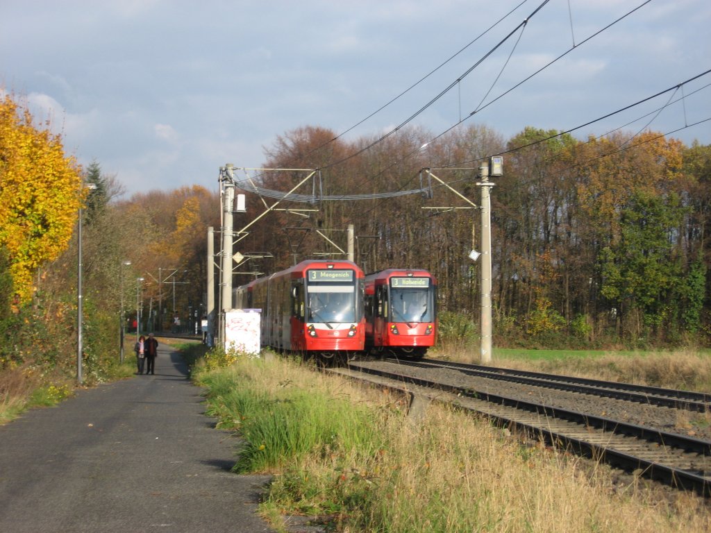 2x 2 ubekannt gebliebene Doppelzüge vom Typ K5100. Beide fahren als Linie 3. Der linke Zug mit Ziel Mengenich und der rechte Zug mit Ziel Holweide. Die Aufnahme entdstand am 08. November 2009 zwischen den Haltestellen "Herler Straße" und "Wischhheimerstraße". Johannes Schwarz