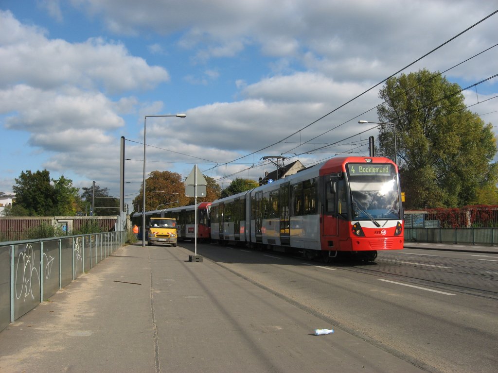 Nachschuß von zwei unbekannten Wagen aus der Serie K5100 die am 14. Oktober 2009 auf der Linie 4 unterwegs waren. Kurz nach Verlassen der Haltestelle "Im Weidenbruch" Fahrtrichtung Schlebusch. Johannes Schwarz