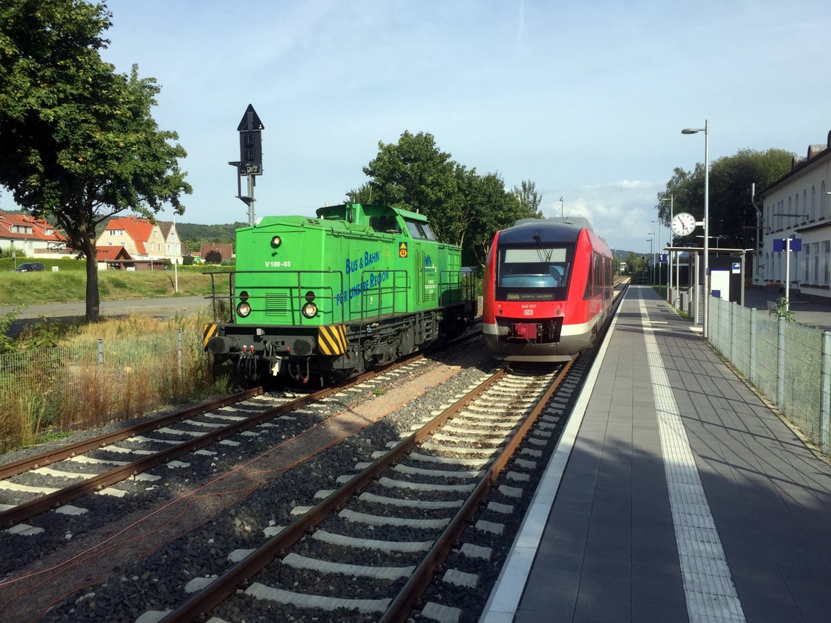 V100 03 der Ilmebahn GmbH (202 655-7) fährt in Einbeck Mitte aus Gleis 2 in das Betriebswerk in Einbeck. Auf Gleis 1 wartet 640 02/ von DB Regio auf die Ausfahrt nach Einbeck Salzderhelden (RB 86). 06.08.2019 Peter Traupe