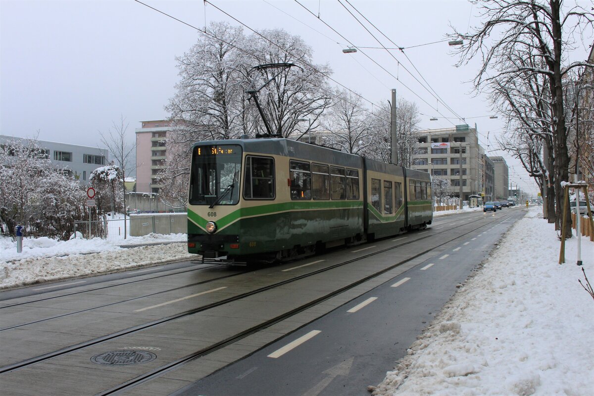 Selten aber doch kommen ältere Wagen wie der Wagen 608 auf der Linie zum Einsatz.