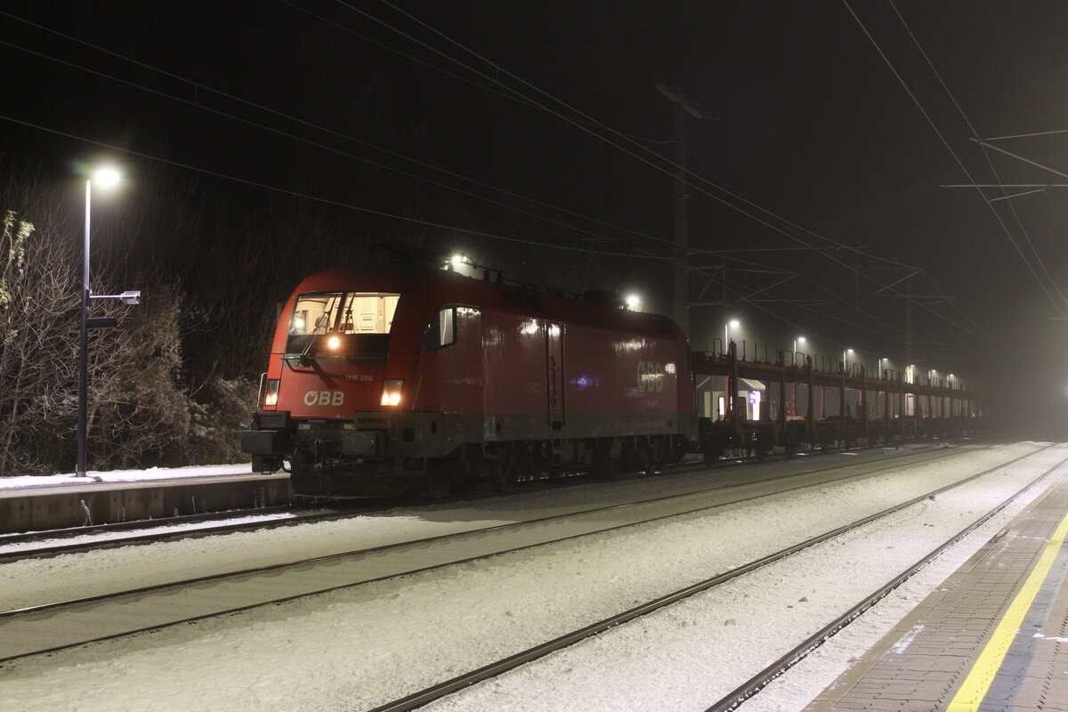 Am kalten Morgen des 11.12.2021 steht die 1116 266 mit dem LGAG49486 von Spielfeld-Straß nach Breclav bei einem kurzen Zugfolgehalt im nebeligen Bahnhof Eichberg. Max Kiegerl