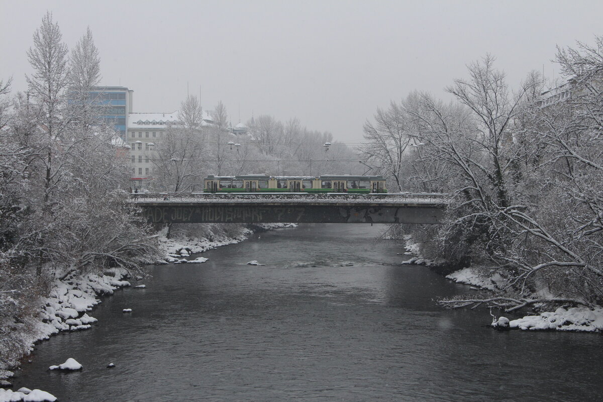 Auf der Linie 4 von Reinighaus nach Liebenau/Murpark fährt am 9.12.2021 ein unbekannter SGP 600er über die Keplerbrücke beim Kunsthaus Graz. Max Kiegerl