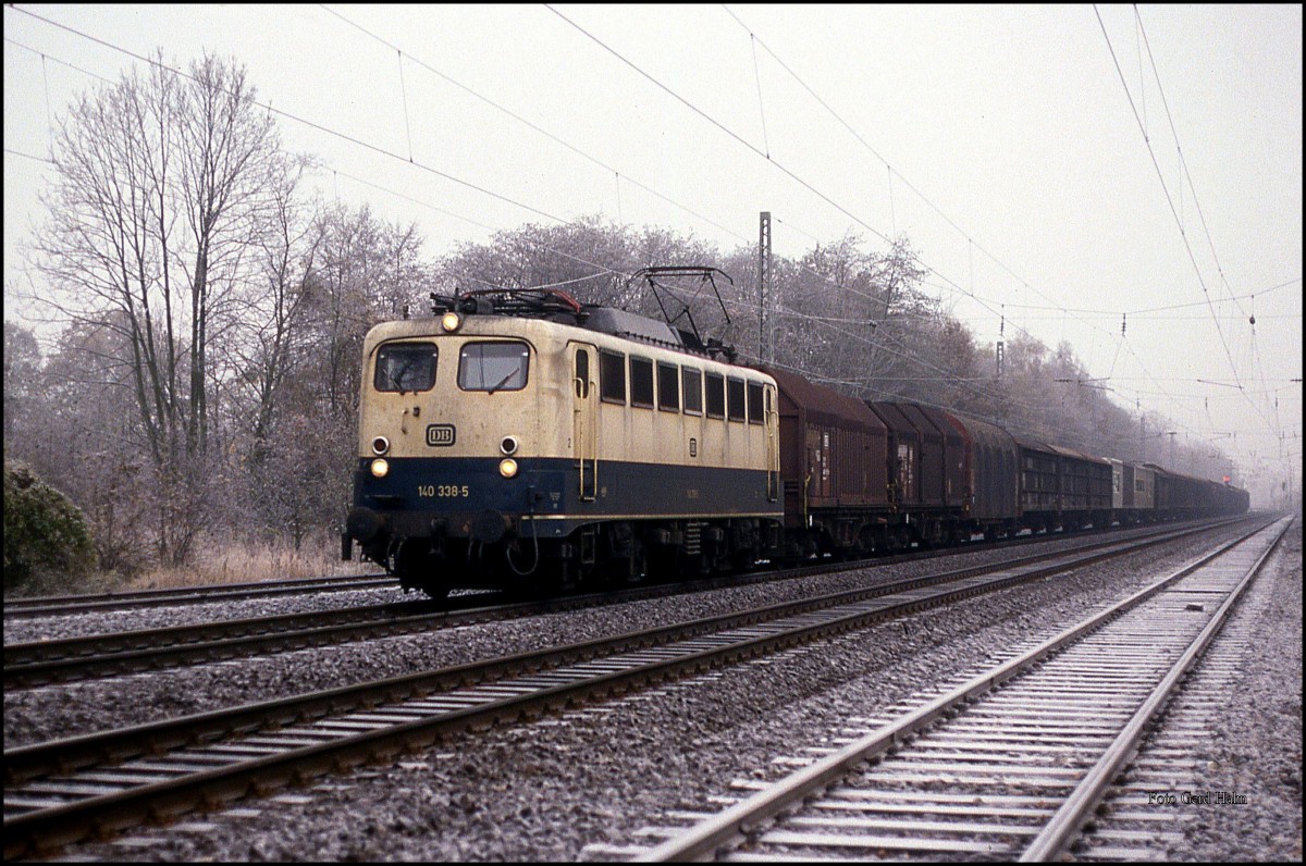 Raureif lag noch auf den Ausweichgleisen des Bahnhofs Natrup-Hagen, als 140338 am 22.11.1991 um 9.32 Uhr mit einem Güterzug in Richtung Münster durch fuhr. Gerd Hahn