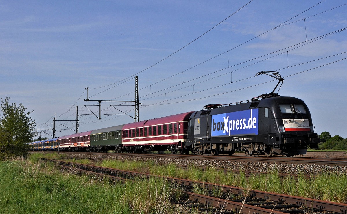 DB Fernverkehr 101 029 "PANORAMAREISEN bahntastisCH" rauscht mit IC 2315 Westerland (Sylt) - Frankfurt (Main) Hbf mit reichlich Verspätung am 11.05.15 in Diepholz (Abzweig Fliegerhorst) dem nächsten Halt Osnabrück entgegen. Reinhard Kühn